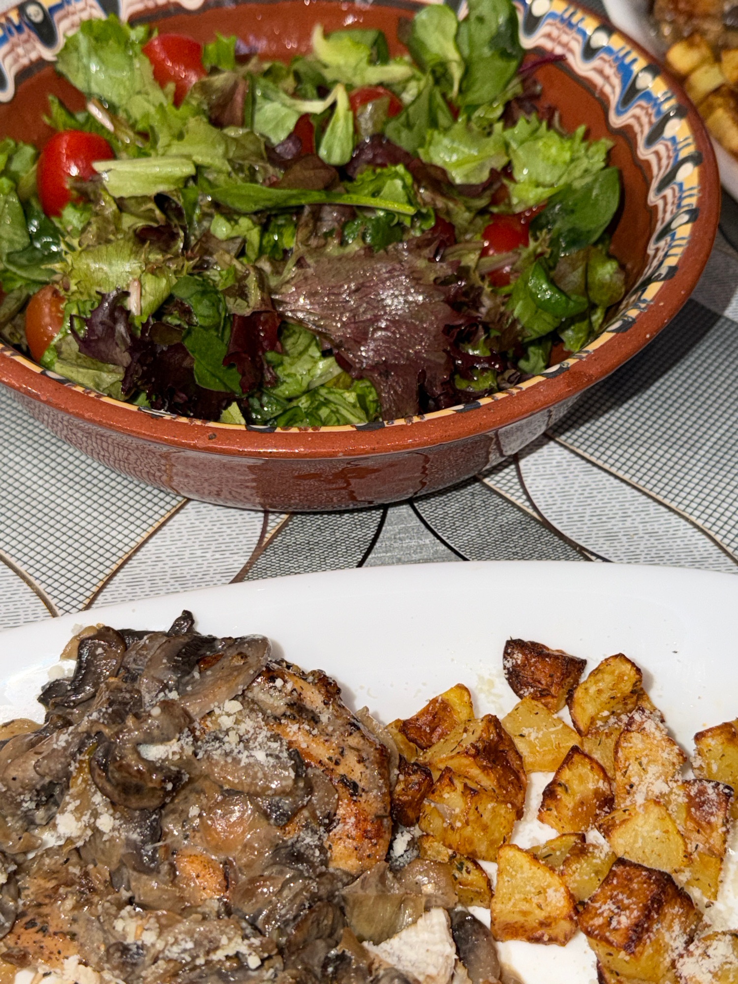 The image shows a meal on a table. On the left is a salad in a decorative bowl, consisting of lettuce and halved cherry tomatoes. On the right, on a white plate, are cubed potatoes topped with what ap…read more