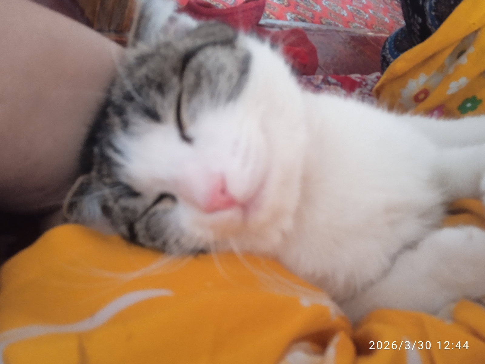 A gray and white cat is sleeping on a yellow blanket. The cat has a pink nose and closed eyes. The timestamp on the image reads "2026/3/30 12:44". The location is unknown, despite the prompt's request…read more