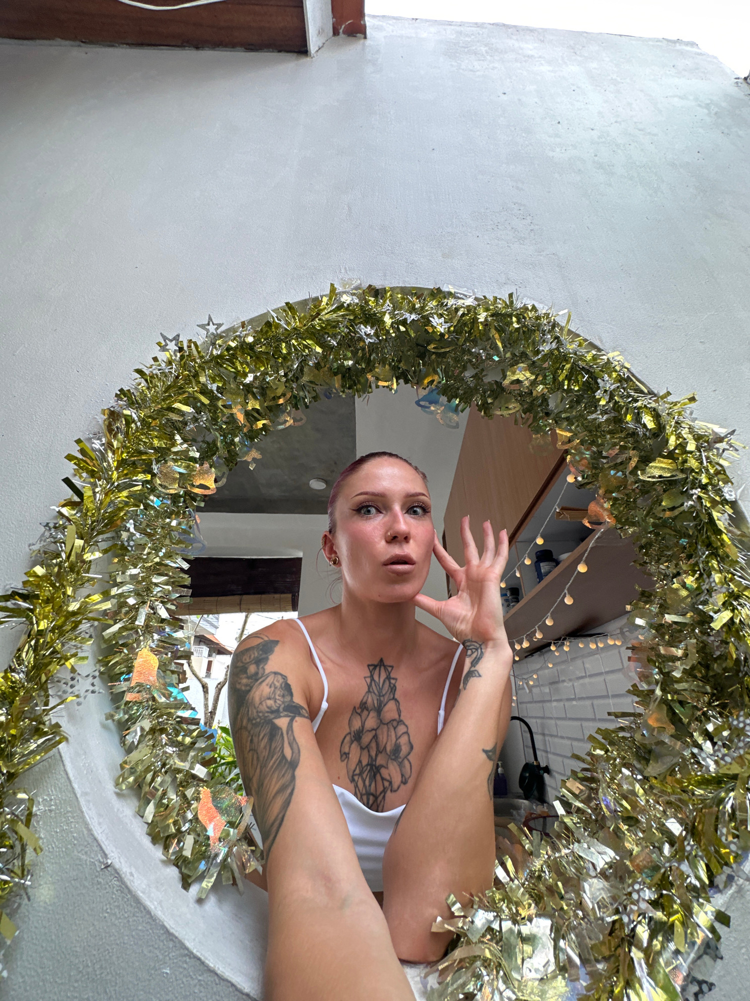 The scene, located in Kerobokan, Indonesia, centers on an individual, appearing female, positioned within a large circular opening or mirror. This circular feature is elaborately decorated with a dens…read more