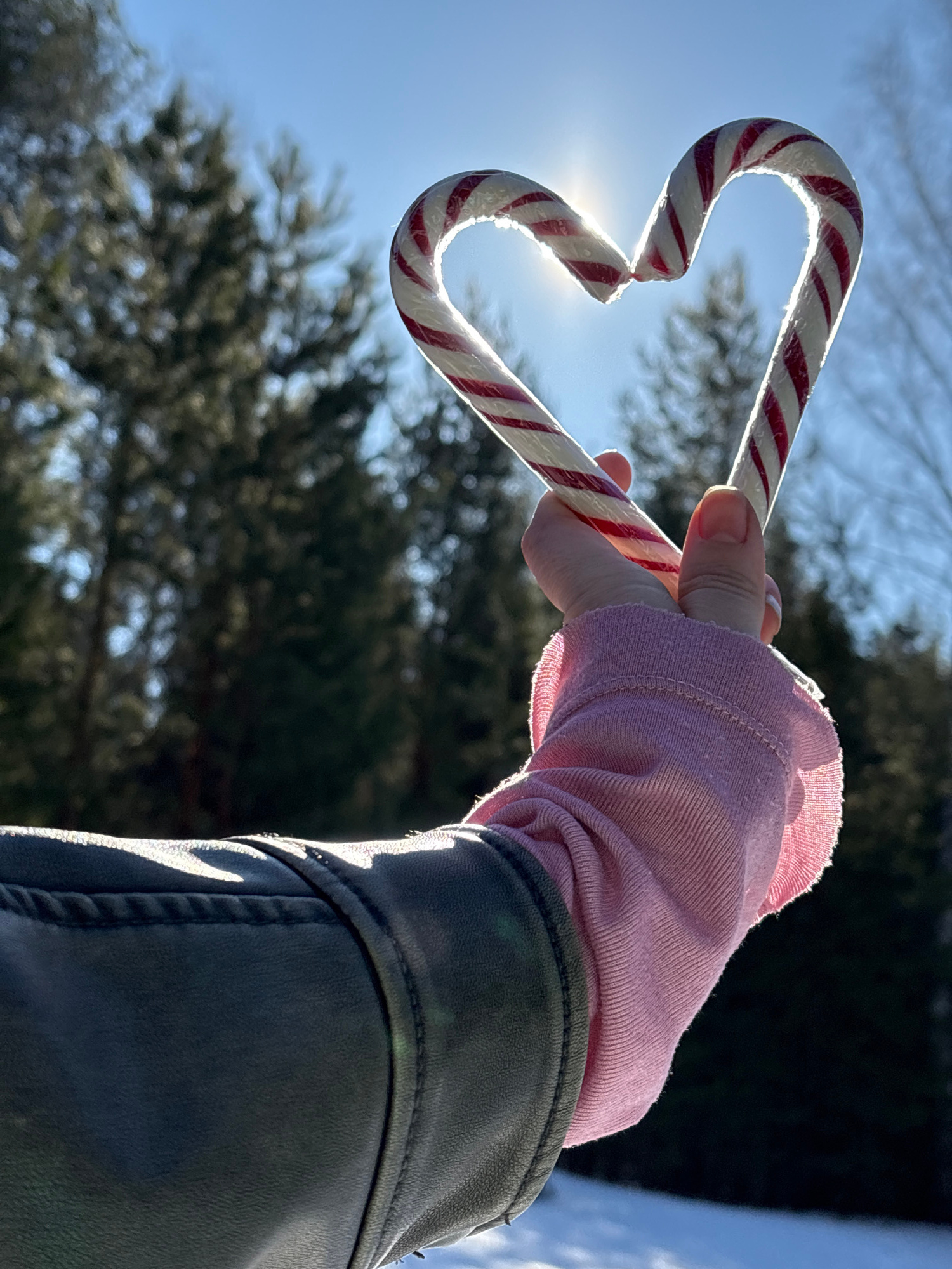 Noviy, Russia: A human hand, positioned in the lower-mid frame, extends upward holding two red and white striped candy canes configured into a heart shape. The individual wears a light pink long-sleev…read more