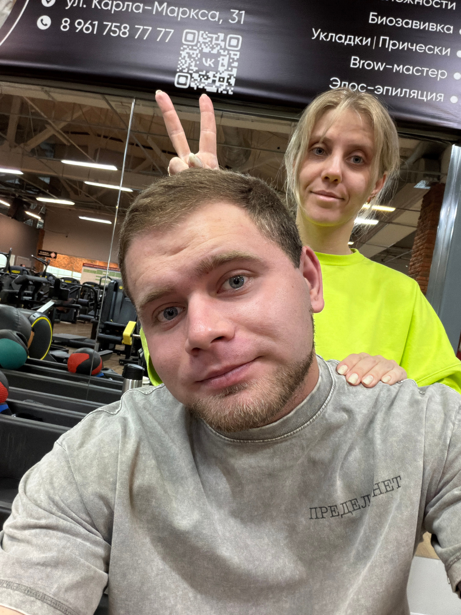 The image shows two individuals, a man and a woman, in an indoor environment. The man is in the foreground, wearing a gray t-shirt with the word "ПРЕДЕЛДЕТ" printed on it. He is making a face and has…read more