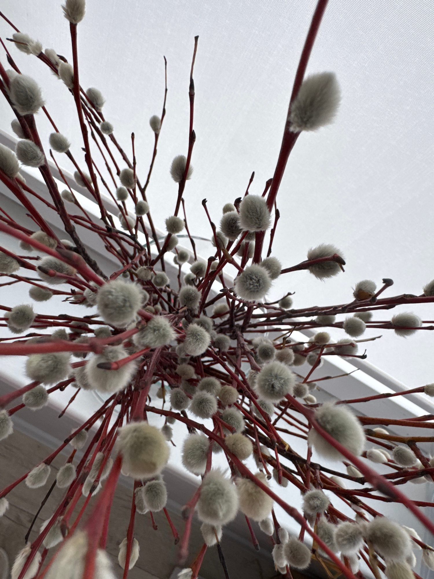 The image shows a close-up, upward-angled view of a cluster of pussy willow branches. The branches are reddish-brown and covered with soft, greyish-white catkins. The background is a pale grey, likely…read more