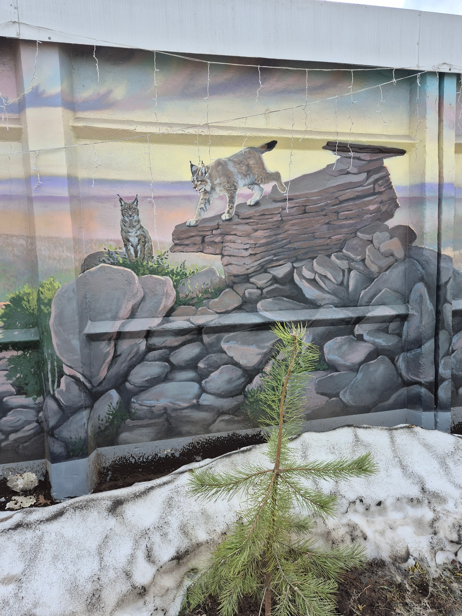 A mural in Chaikovsky, Russia, depicts two lynx cats amidst a rocky, mountainous scene. A live pine sapling obscures part of the mural, along with remnants of snow. The mural itself appears to be pain…read more