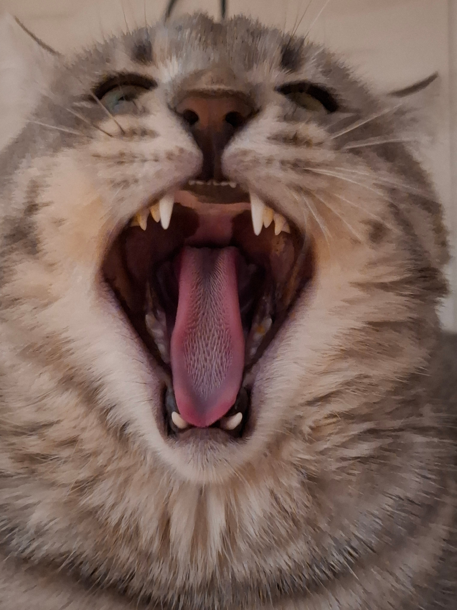 A close-up, upside-down perspective of a grey tabby cat with its mouth wide open, revealing a pink tongue and sharp teeth. The cat's fur is short and dense, with a grey and beige striped pattern. The…read more