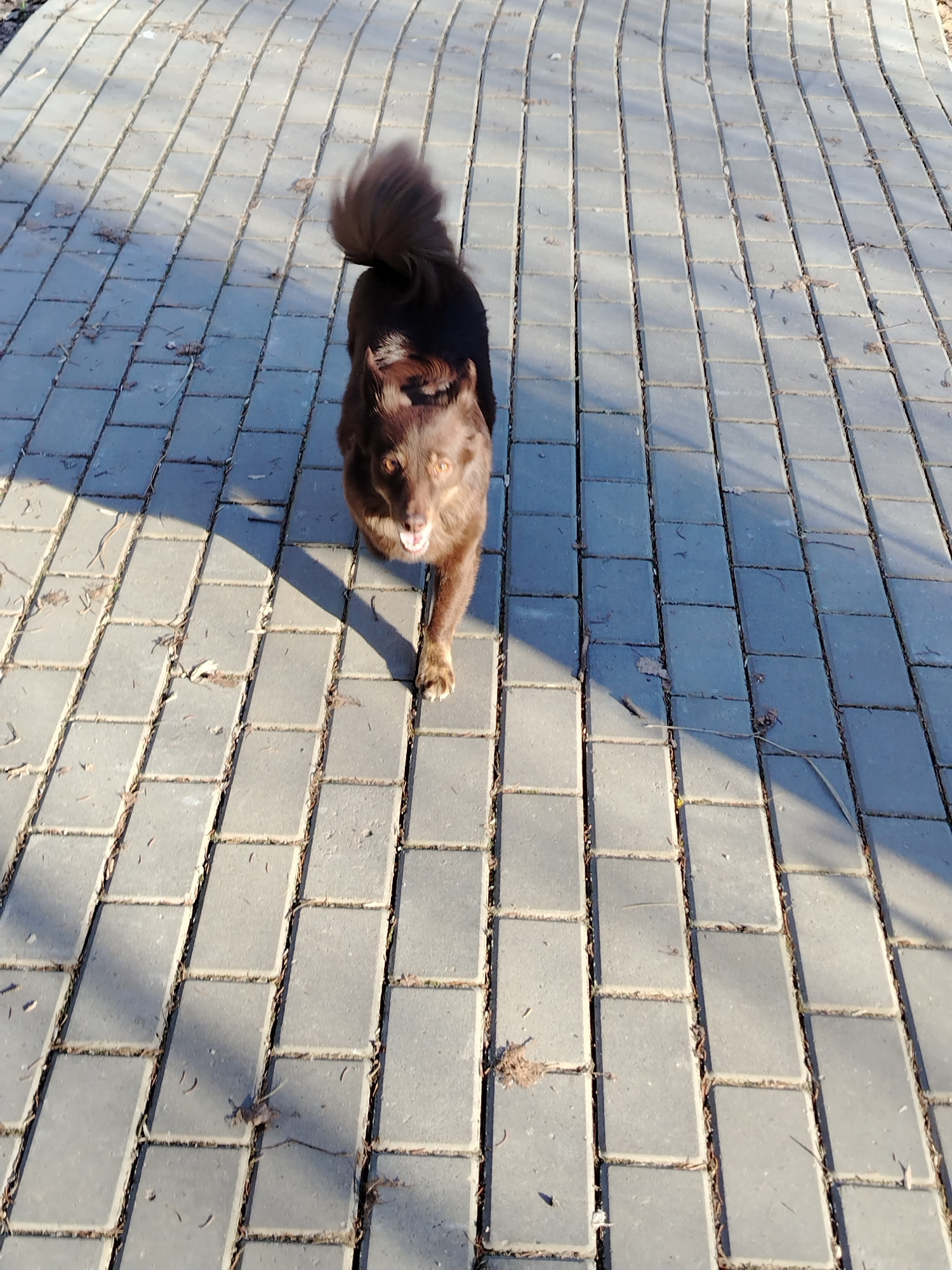 A brown medium-sized dog with a curled tail is walking toward the viewer on a paved path. The path is constructed of rectangular gray pavers, aligned in rows. Shadows cast by trees or other objects arβ¦read more