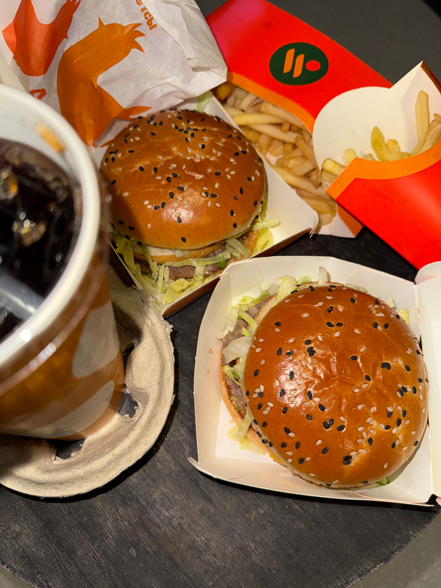 A still, top-down shot shows a fast-food meal on a black surface. The meal includes two burgers in cardboard containers, one with an orange wrapper featuring an abstract chicken wing and Cyrillic text…read more