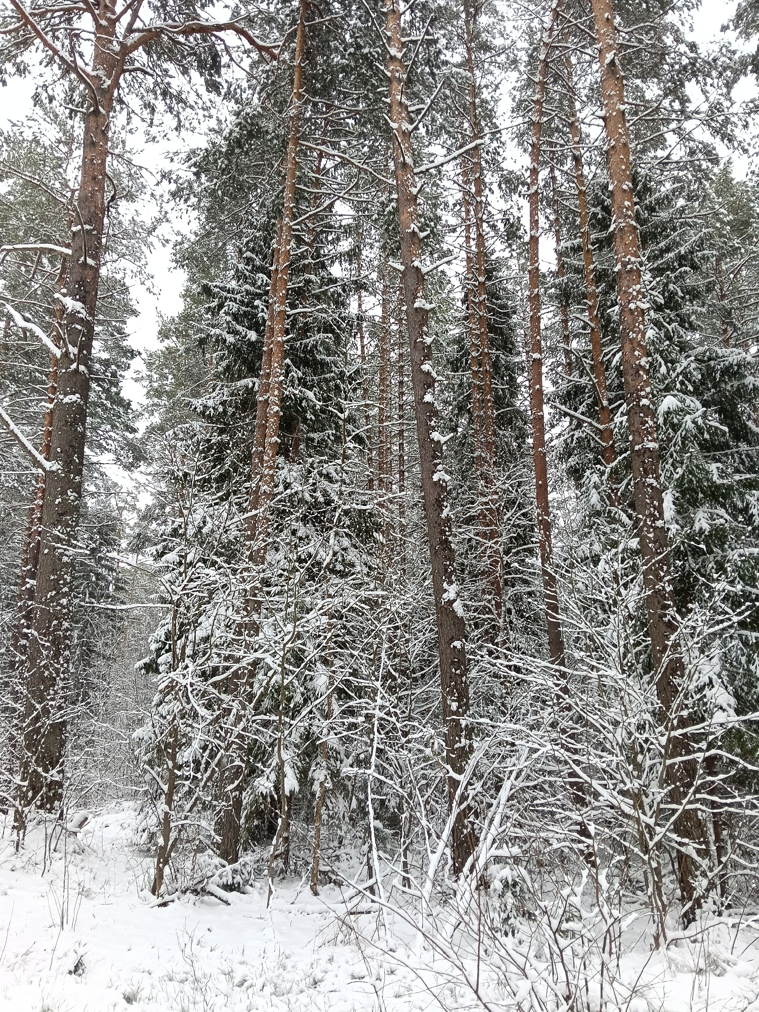 The image captures a serene winter forest scene, likely during daytime under an overcast sky. The primary subjects are numerous tall pine trees with dark brown, textured trunks, and smaller deciduous…read more