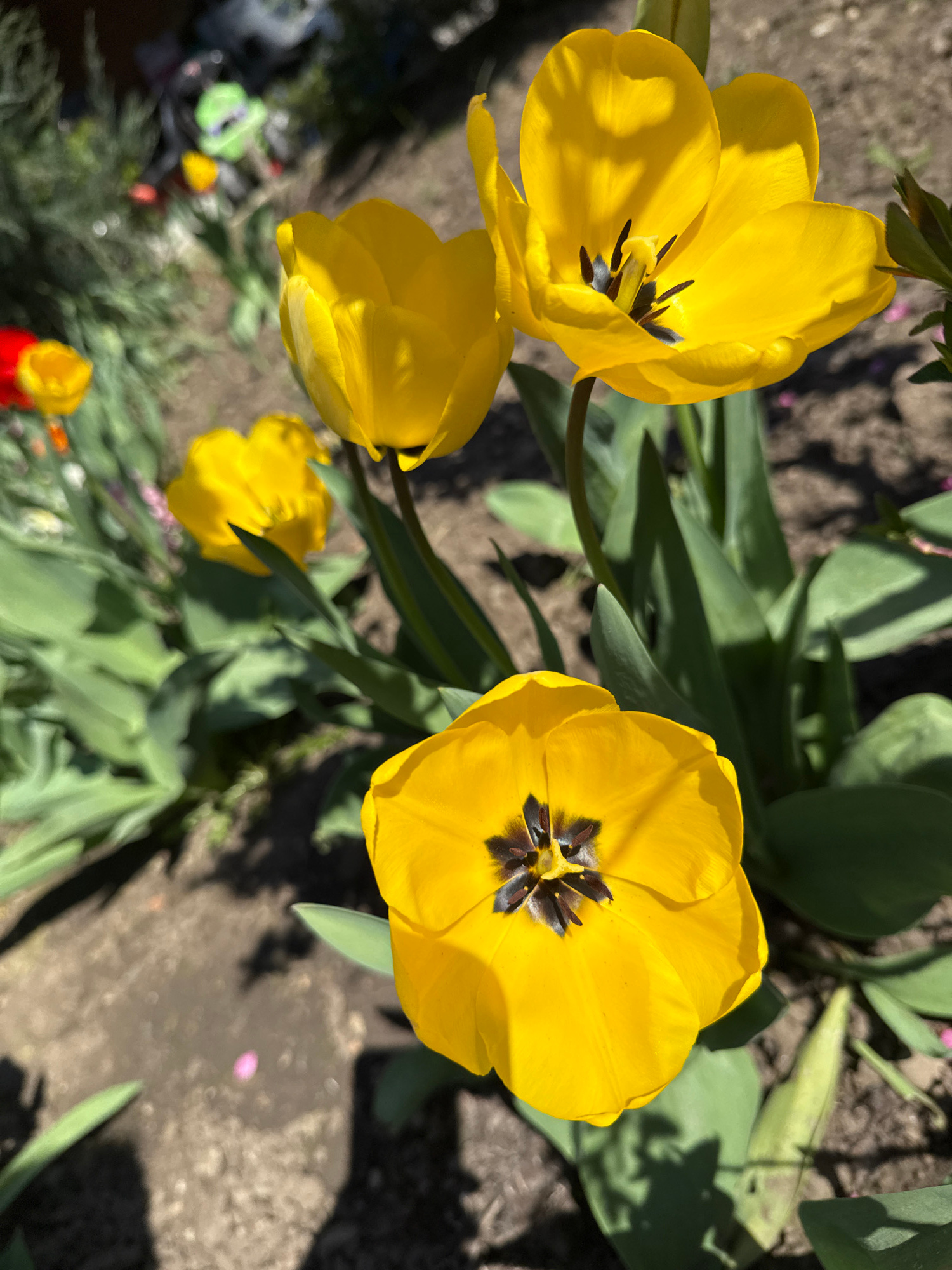A high-angle close-up shot shows a cluster of yellow tulips in a garden setting. The tulips are in various stages of bloom, with one fully open, revealing its dark center. The background consists of g…read more