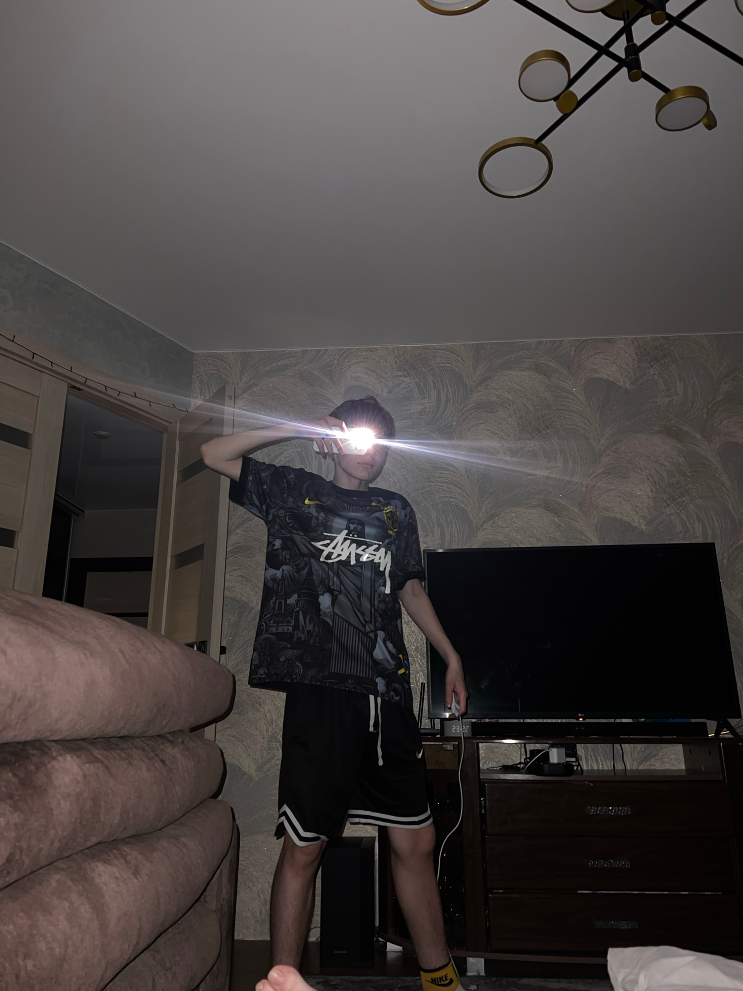 A person stands in a room, holding a phone with its flashlight on, obscuring their face with a bright light. They wear a patterned black t-shirt and black shorts with white stripes. Behind them is a p…read more