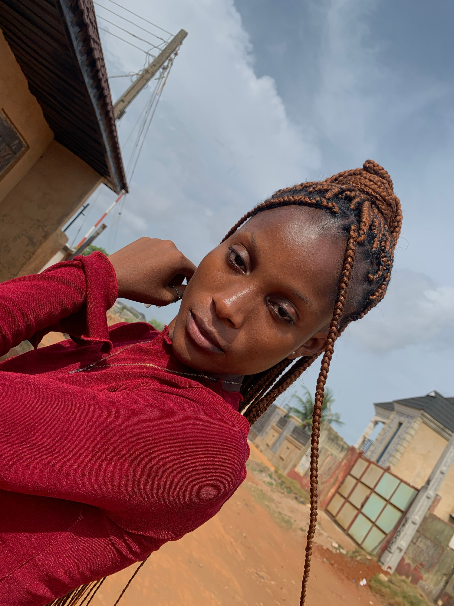 A medium-shot photograph shows a young, brown-skinned woman wearing a red, long-sleeved shirt, with her head slightly tilted down and to the left. Her hair is styled in neatly braided extensions, pull…read more