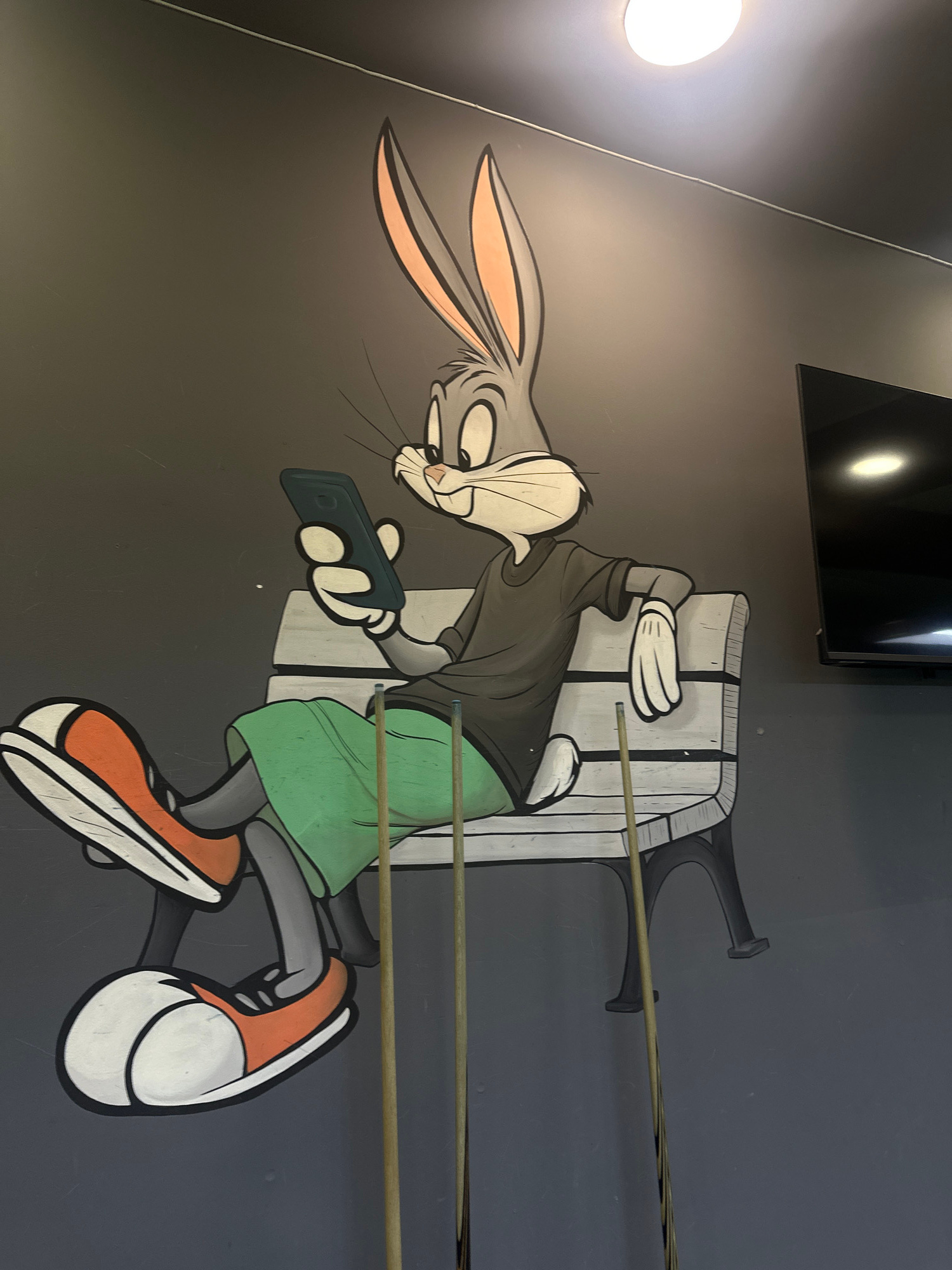 A mural on a gray wall in Yerevan, Armenia, depicts a cartoon figure resembling Bugs Bunny. The figure is portrayed as being struck by billiard cues, with three cues visually piercing through the char…read more