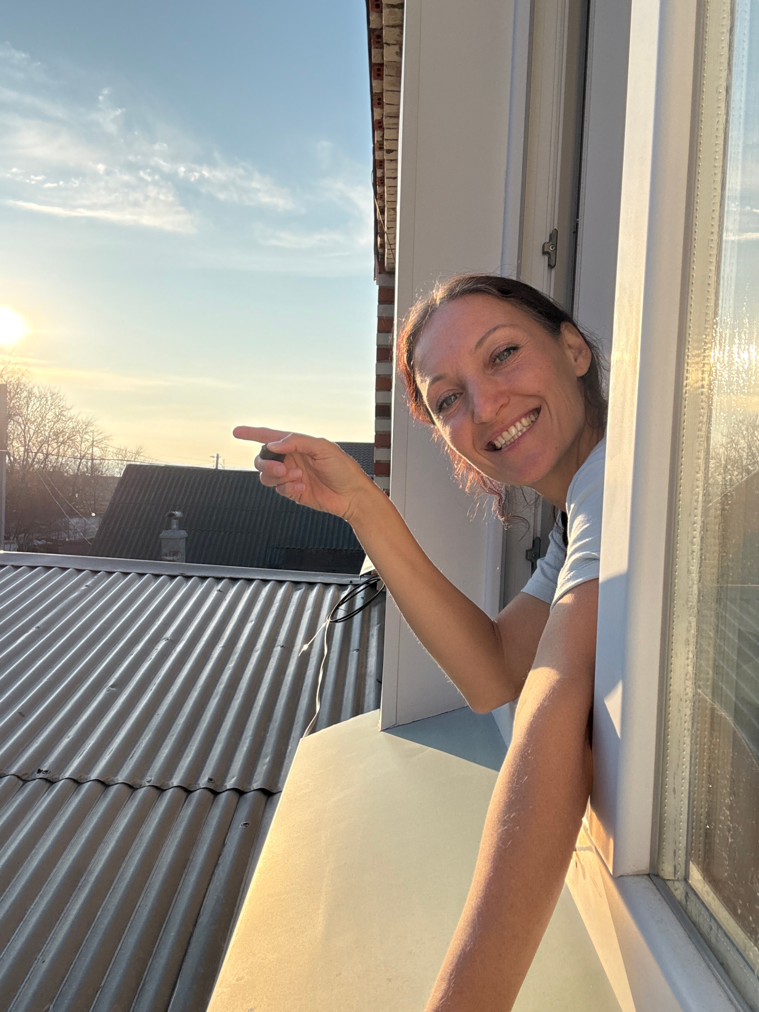 A woman with brown hair and a white t-shirt smiles and points her finger out of a window. Outside the window, the sky is visible with some clouds and the sun shining. The scene appears to be from a ci…read more