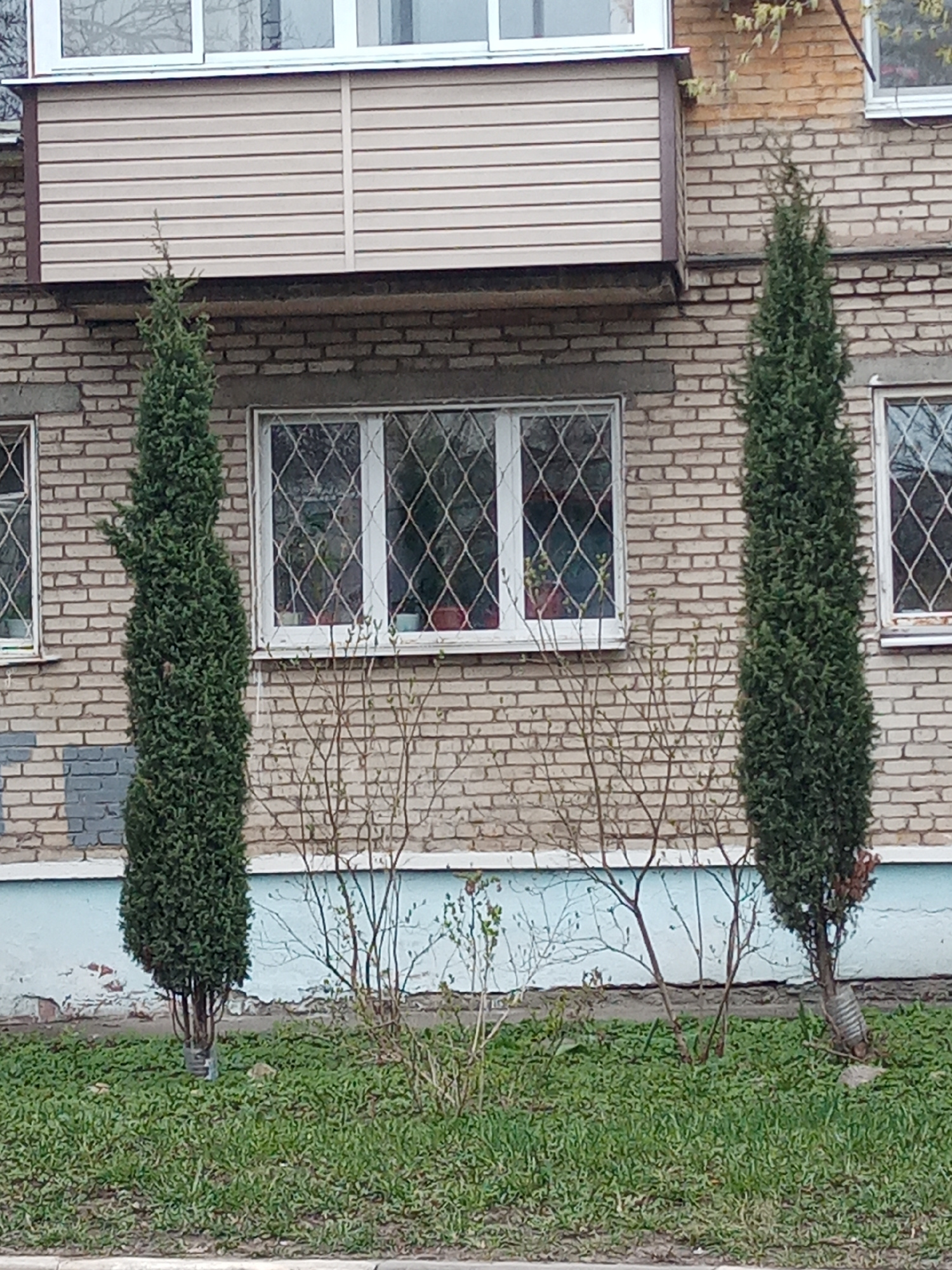 The image shows a brick building with windows protected by diamond-patterned security grilles. Two columnar evergreen trees flank the window area, partially obscuring the facade. Between the trees areβ¦read more
