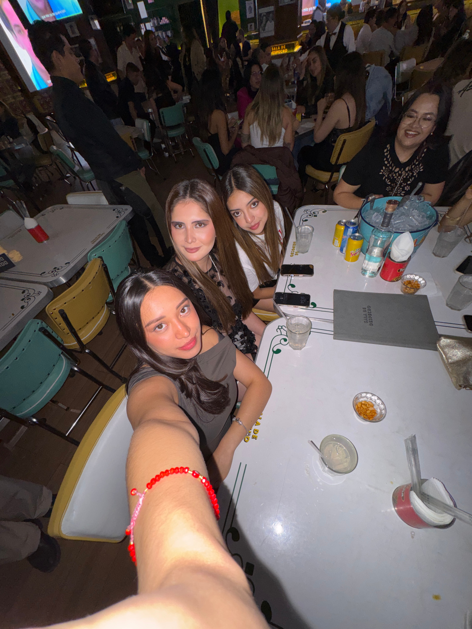 The image depicts an interior scene within a bar or restaurant named "La Sala de Despecho" in Puebla, Mexico. The establishment is dimly lit, featuring white rectangular tables with green decorative t…read more