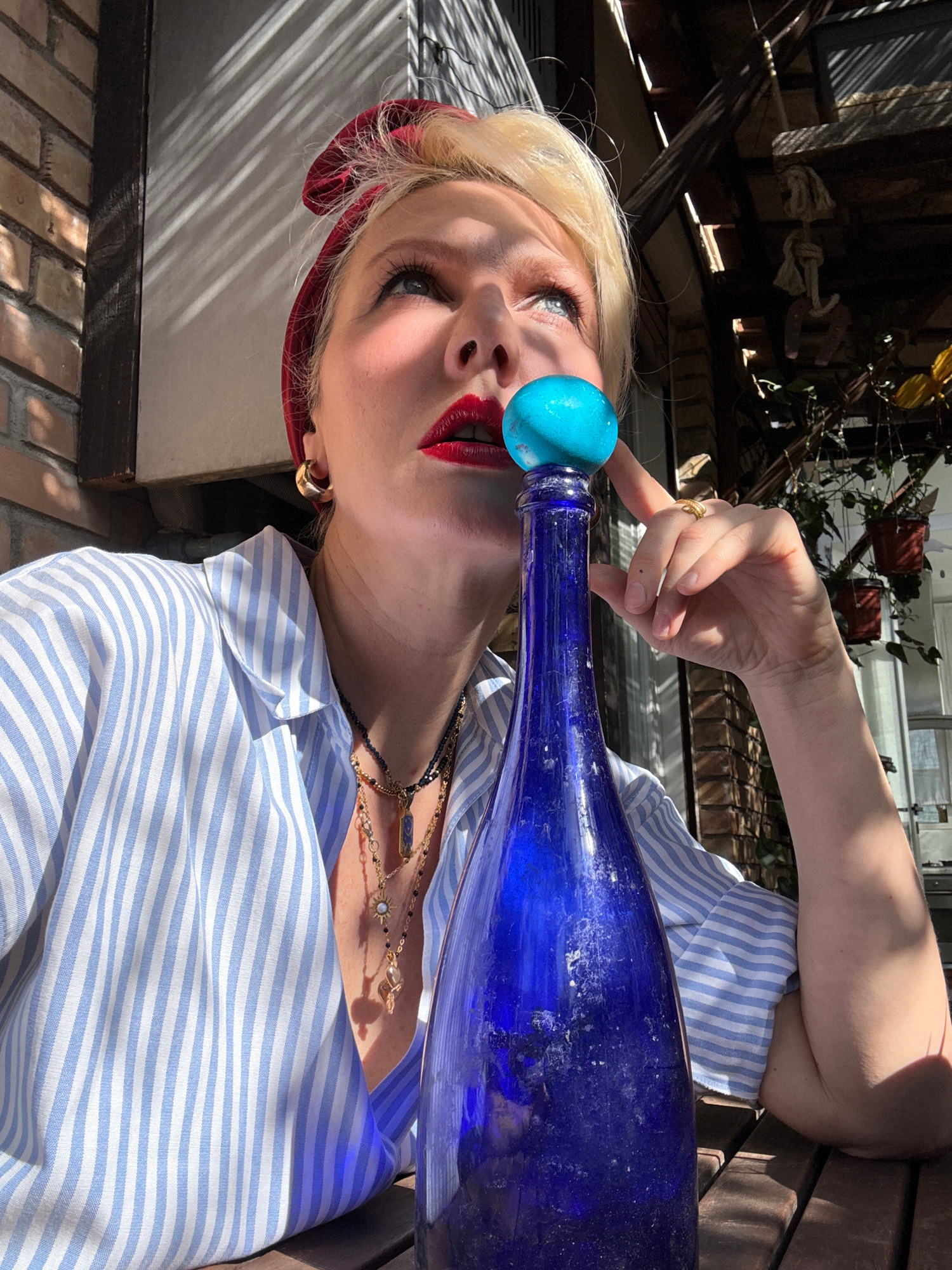 A woman with blonde hair and red lipstick poses with a blue glass bottle, the neck of which is pressed against her nose. She is wearing a blue and white striped shirt, gold earrings, a red headband, a…read more