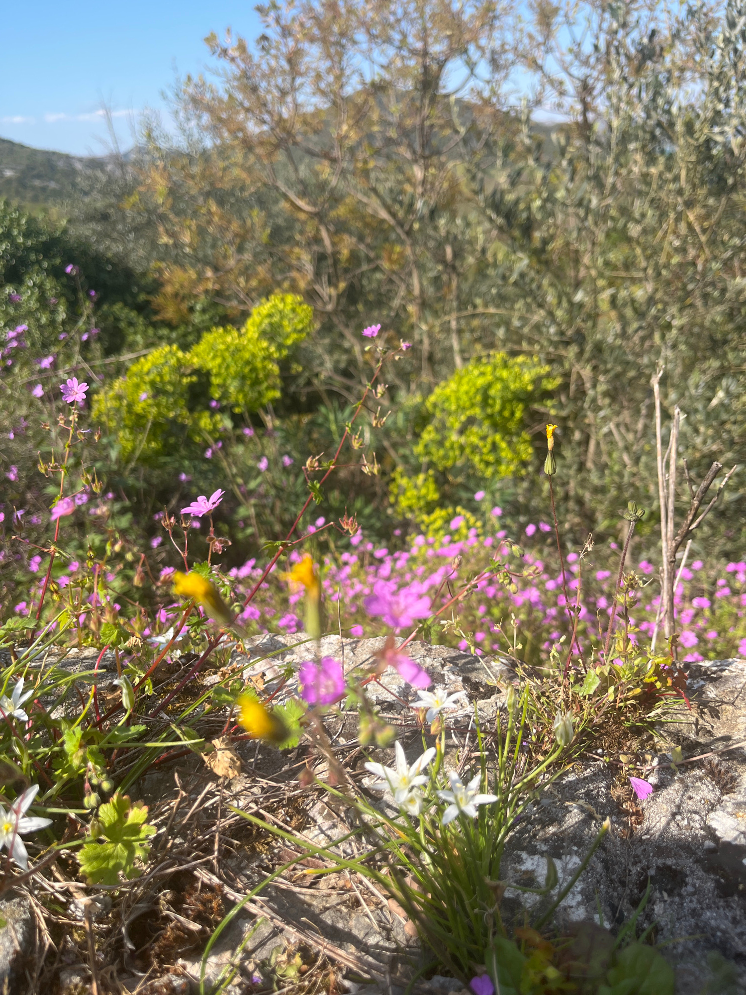 The image depicts a rocky surface covered with vegetation, including small purple and white flowers, likely located in or near Godinje, Montenegro. The flowers and other green plants are growing on th…read more