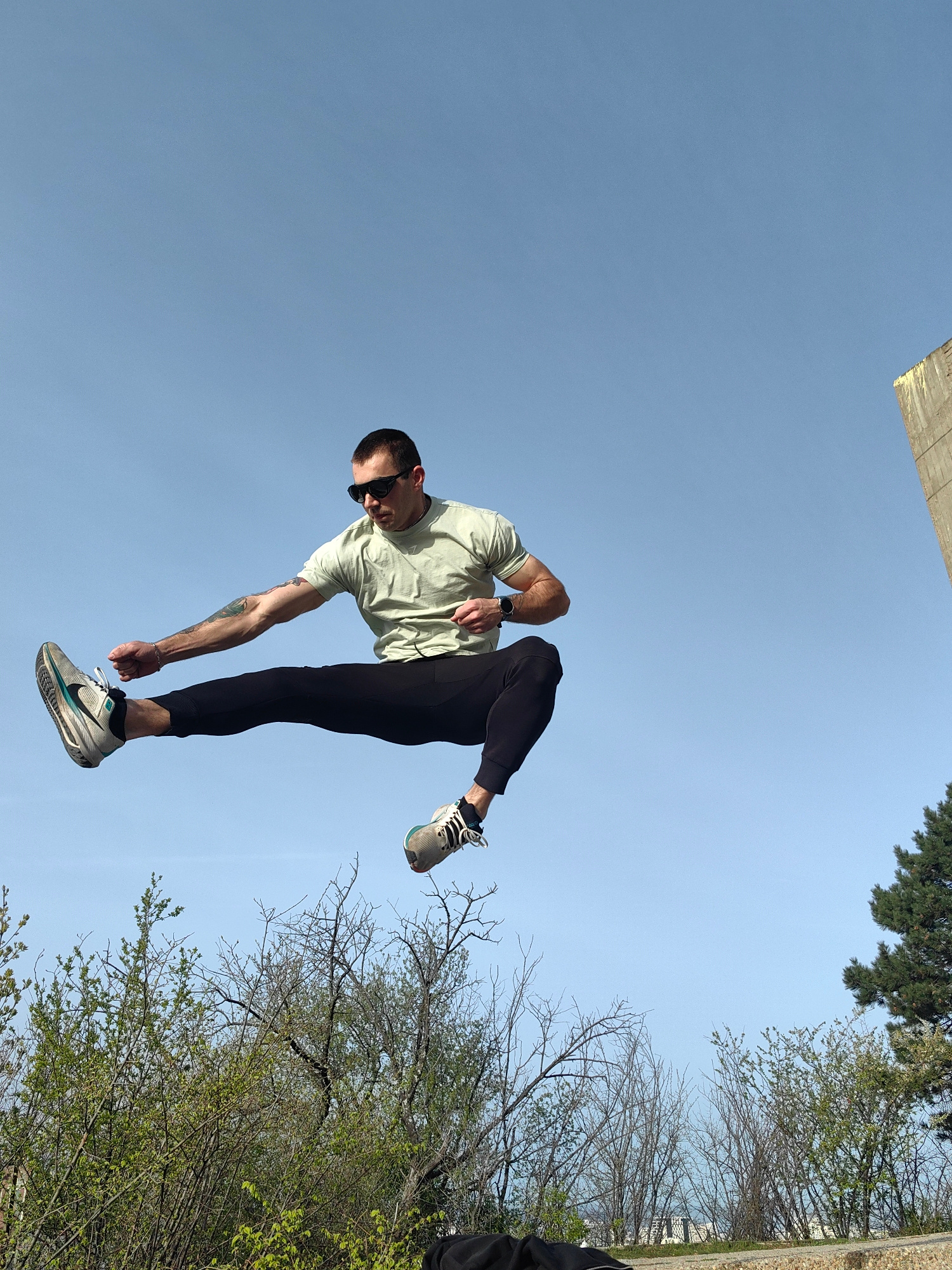 The image captures a man in mid-air, seemingly performing a martial arts-style kick. He is wearing sunglasses, a light green t-shirt, black leggings, and athletic shoes. His left leg is extended strai…read more