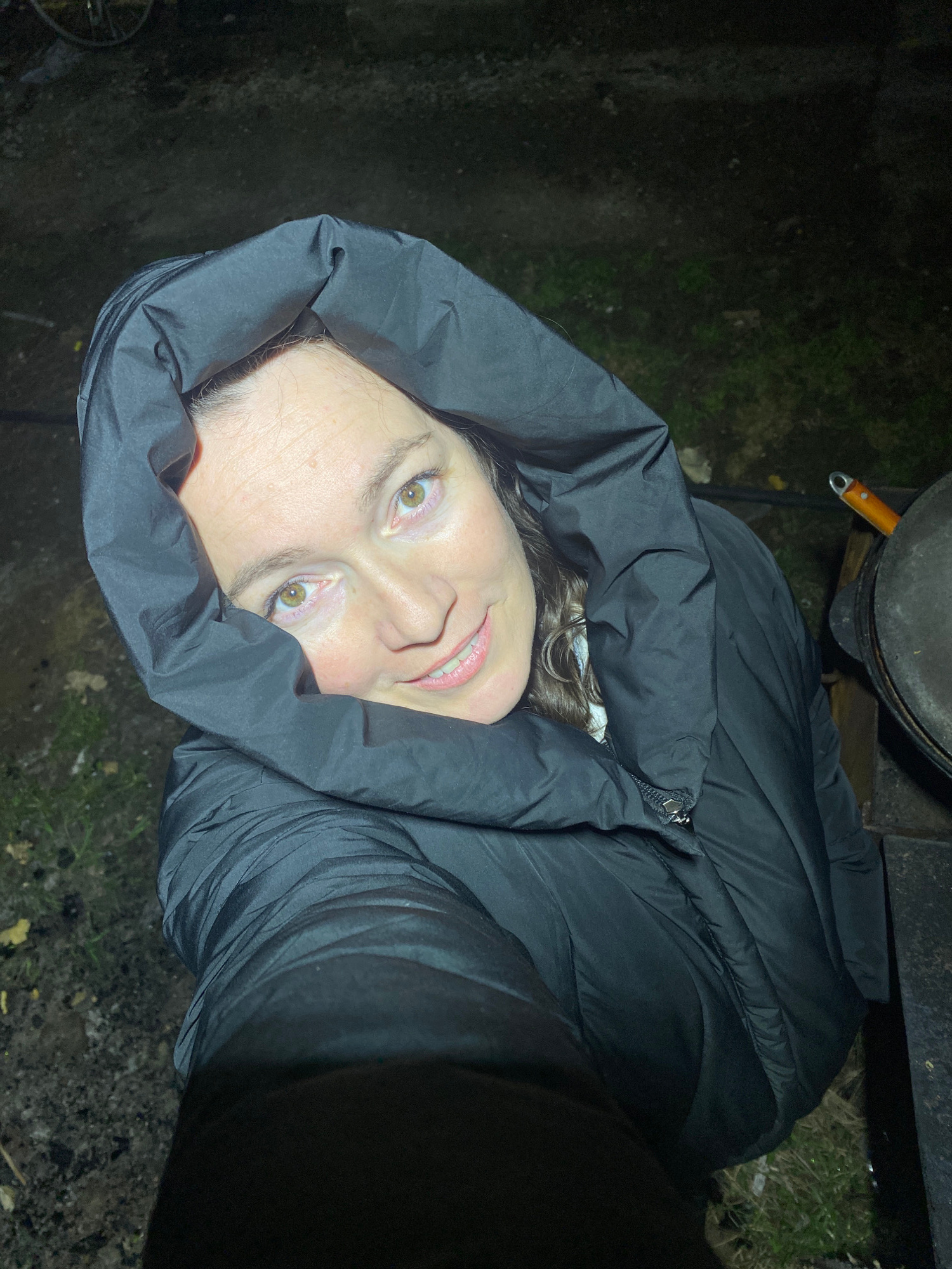 The image shows a person, likely female, with light skin, brown hair, and striking green-hazel eyes, captured in a close-up, high-angle shot. Her head is tilted to the side, and she looks directly int…read more