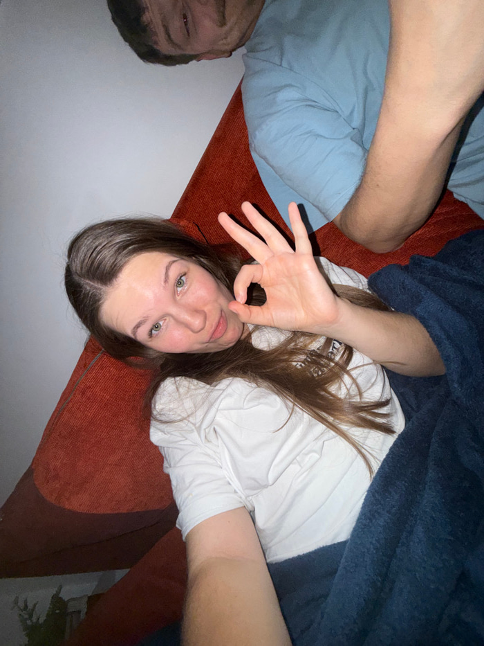A selfie-style photo features two individuals lying on a couch. A woman with long brown hair and a white shirt is closer to the camera, making the "OK" hand gesture. A blue blanket partially covers he…read more