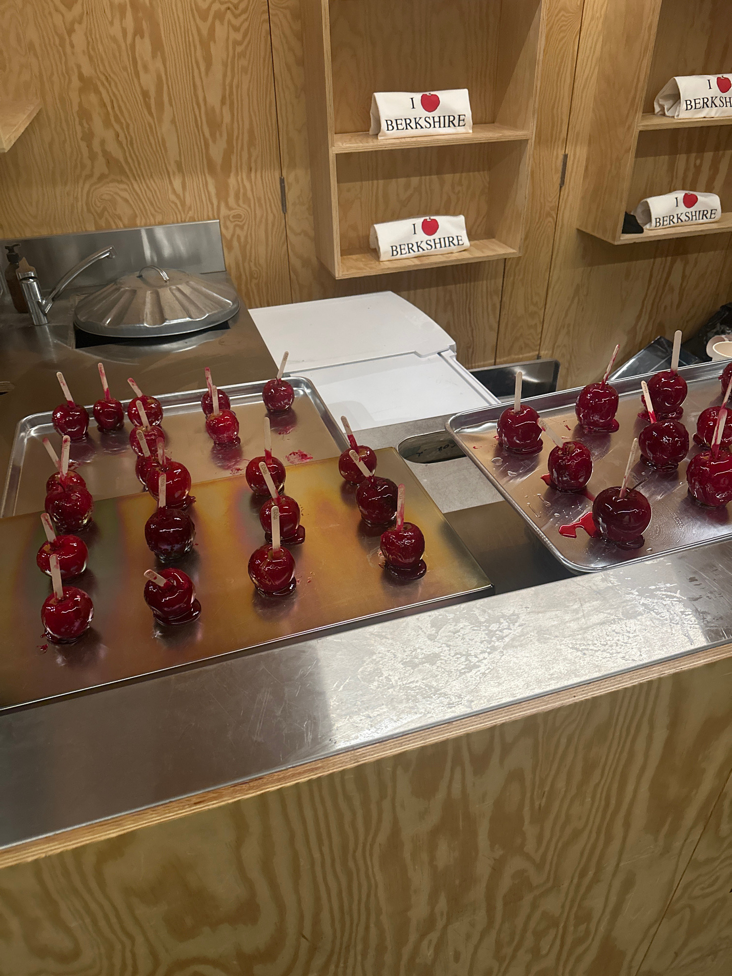 This image captures a display of numerous red candy apples set against a wooden and metallic background, likely in an indoor commercial setting such as a market or fair stall. The primary subjects ar…read more