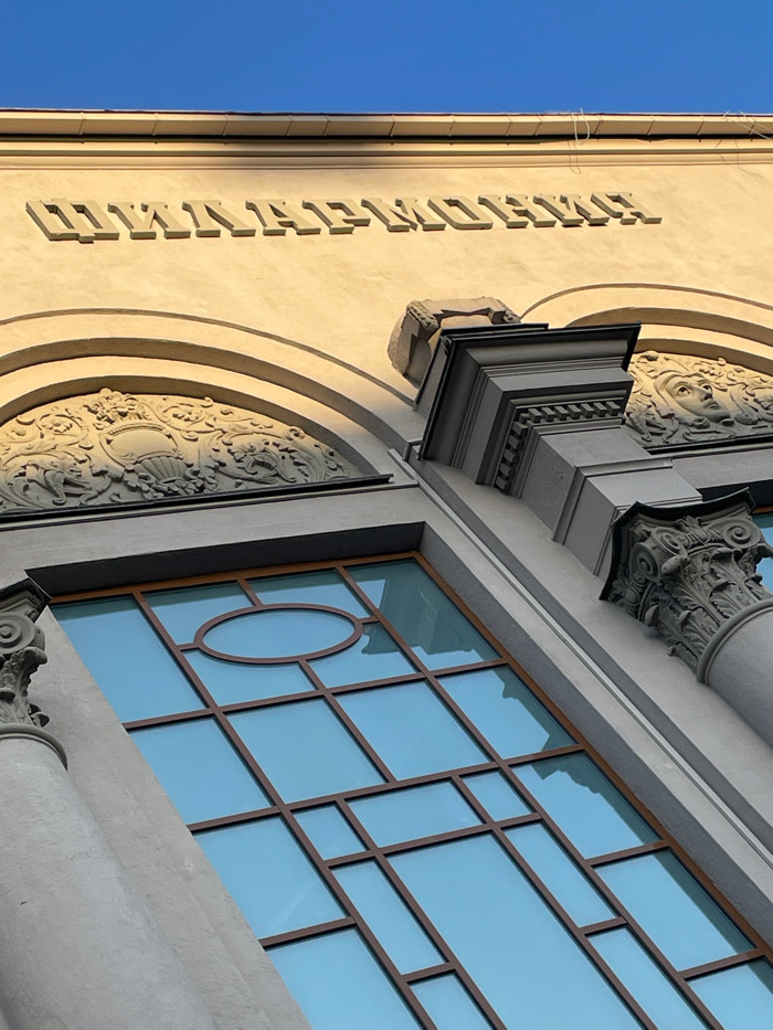 An upward-angled exterior view captures the ornate facade of the former Circus-Variety "Armoniya" building, now the Sverdlovsk Academic Drama Theatre, located at Prospekt Lenina, 48 in Yekaterinburg,…read more