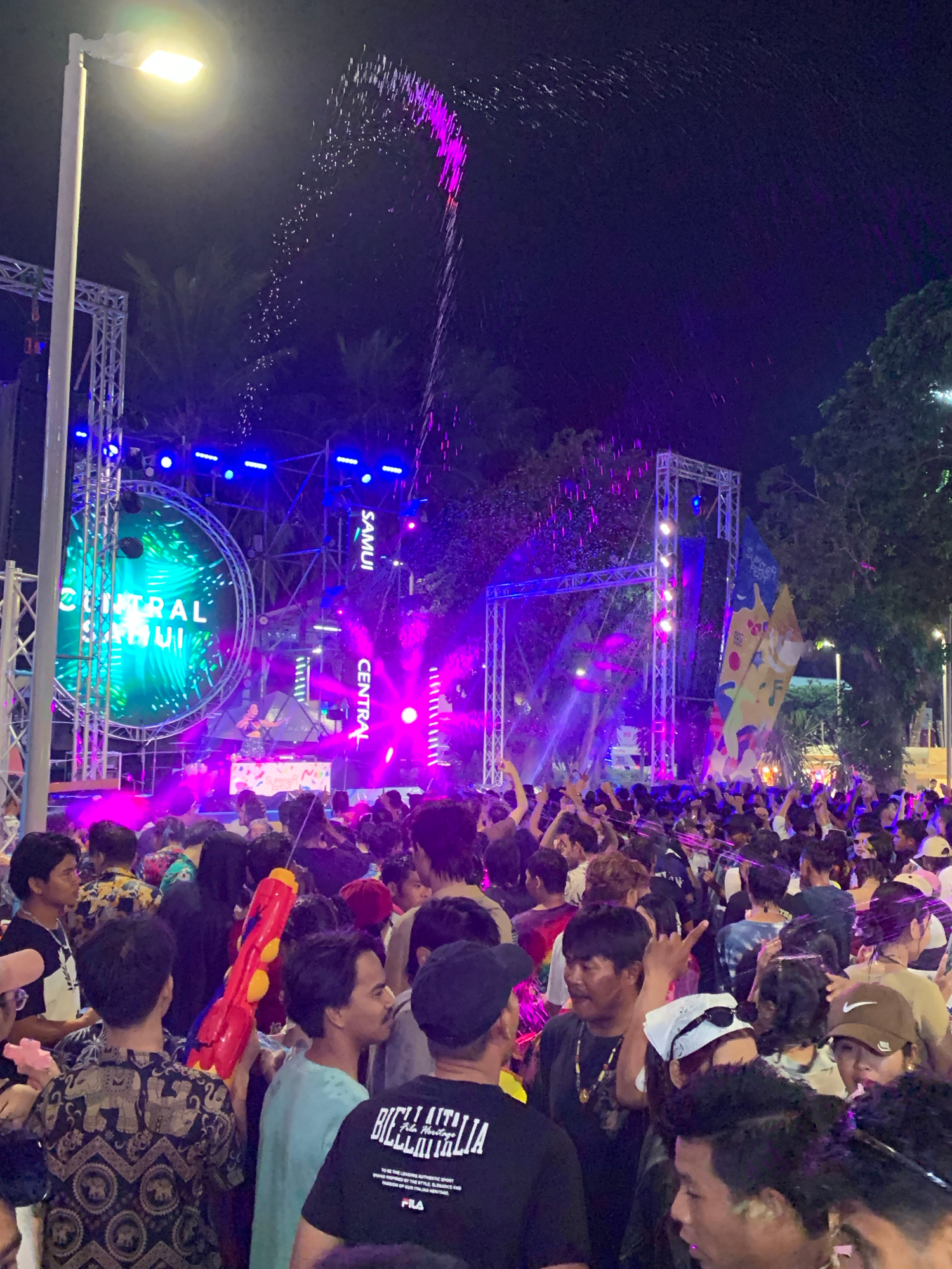 The image depicts a crowd of people in Baan Chaweng, Thailand, at night. Many of the people are holding water guns. There is a stage structure with the words "Samui Central" displayed on it, lit up wi…read more