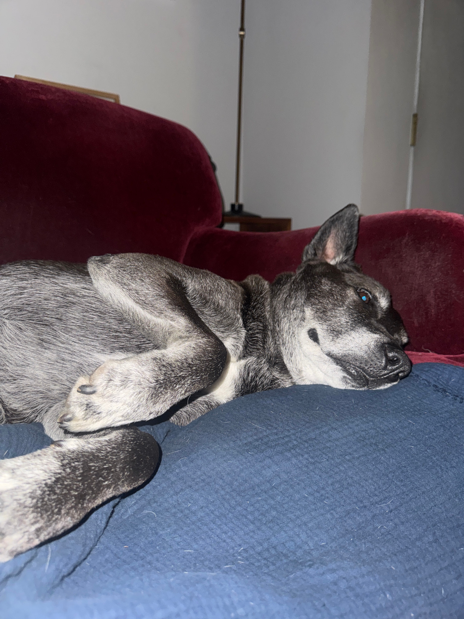 A gray-and-white dog is lying on a blue cushion, resting its head and front paws on the cushion. The dog is in a relaxed pose, looking up. Behind the blue cushion is a burgundy-colored cushioned objec…read more