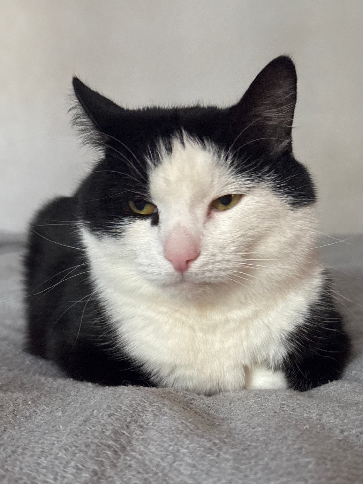 A medium, close-up, portrait-style shot of a black and white cat. The cat is nestled next to a gray, textured surface, possibly a piece of furniture. The cat has a mostly white face, with black markin…read more