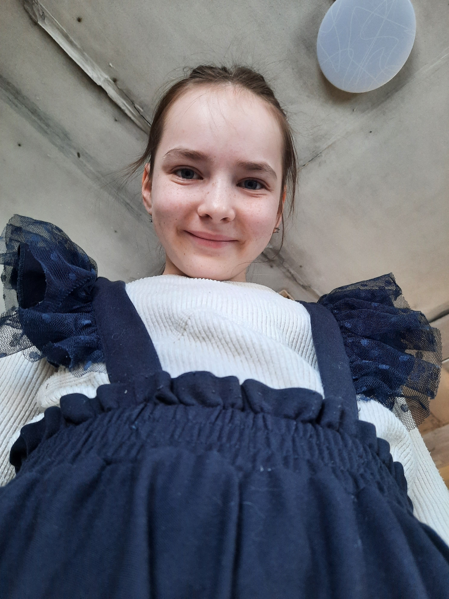 A person with light skin and brown hair is wearing a white top with a navy blue dress that has ruffled, dotted netting on the straps. The person is smiling and looking directly at the camera. A round,…read more