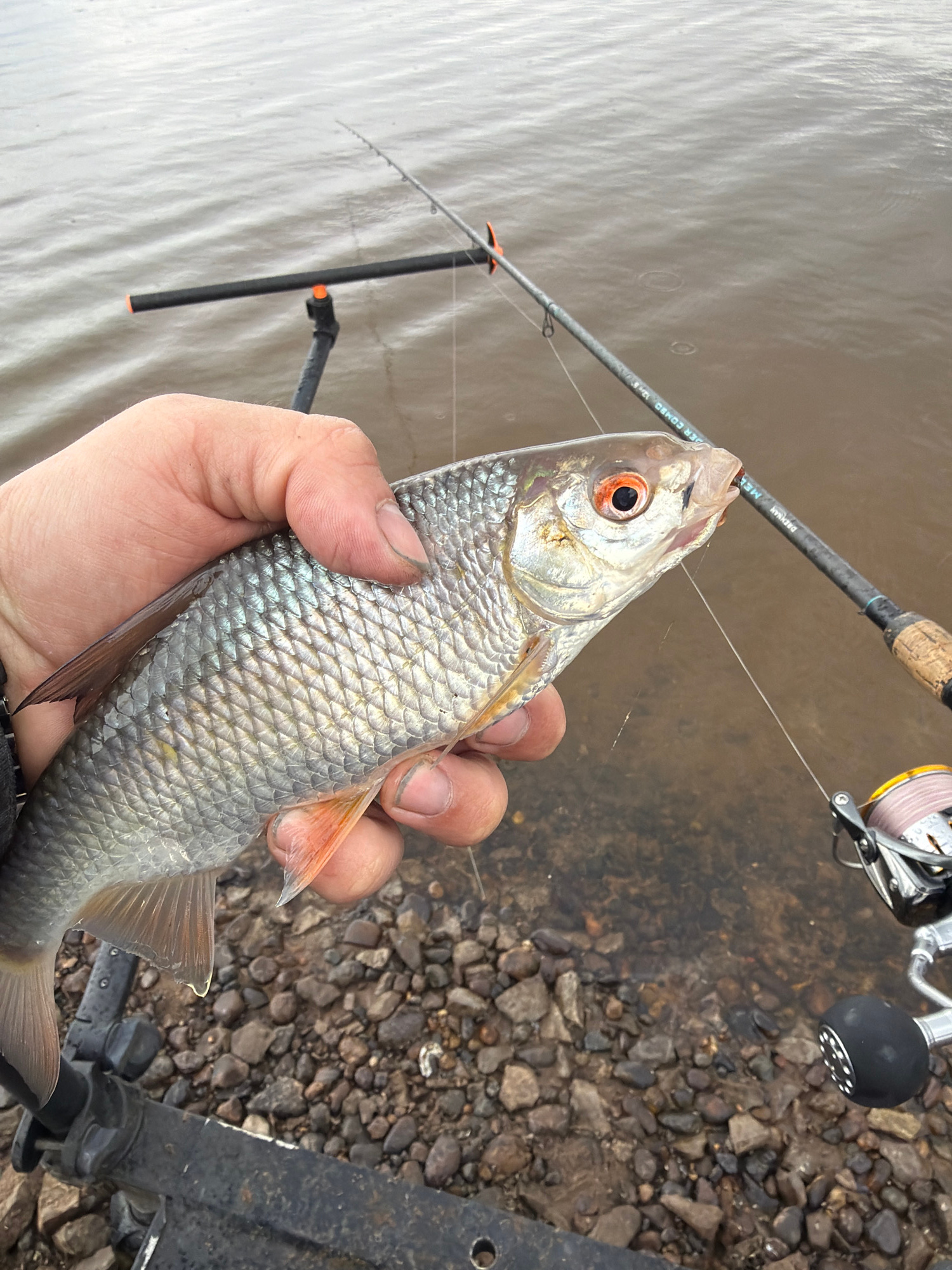 A hand holds a silver fish with red eyes and orange fins. A fishing rod lies nearby, with a reel visible. The background includes water and a rocky shoreline. The location is not explicitly identifiab…read more