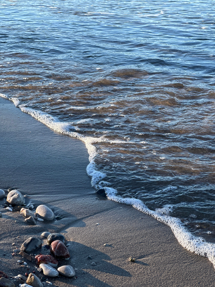 The image displays a close-up, downward-angled view of a beach shoreline in Šušanj, Montenegro. The scene captures the interface between ocean water and sand under natural illumination. The upper two-…read more