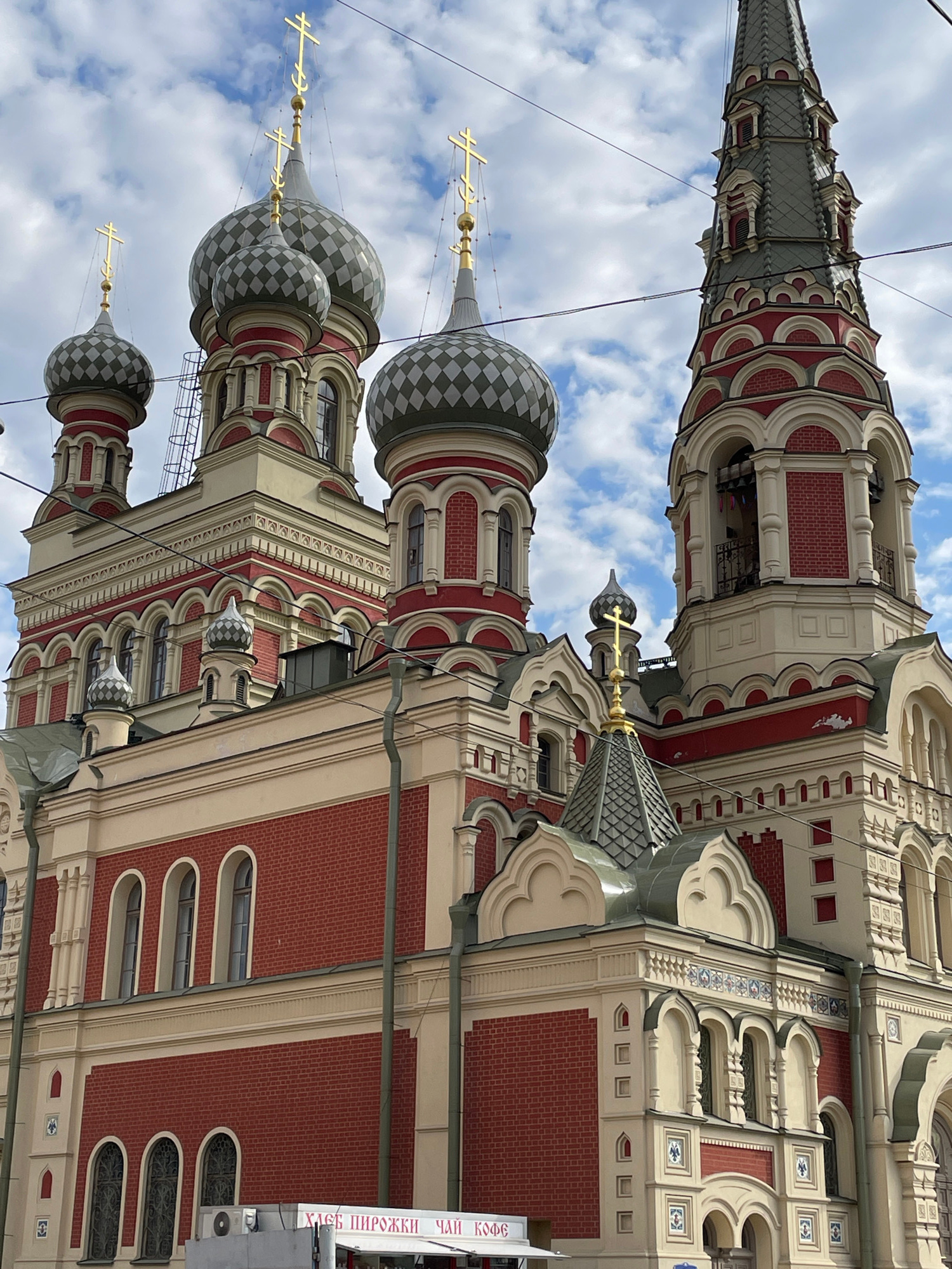 The image captures a grand, ornate Russian Orthodox church under a bright, partly cloudy sky. The primary subject is the multi-domed and spired church, characterized by its distinctive red brickwork c…read more