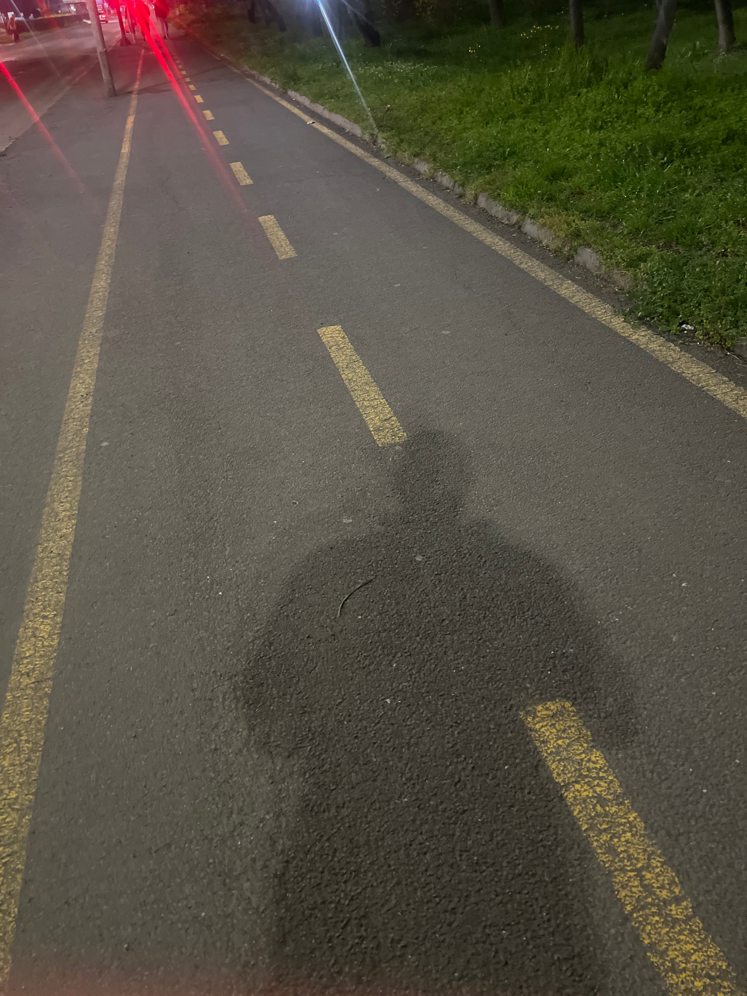 This image shows a paved bicycle path marked with yellow lines in Burgas, Bulgaria. The path is adjacent to a grassy area on the left and extends into the distance. There's a shadow cast on the path,…read more