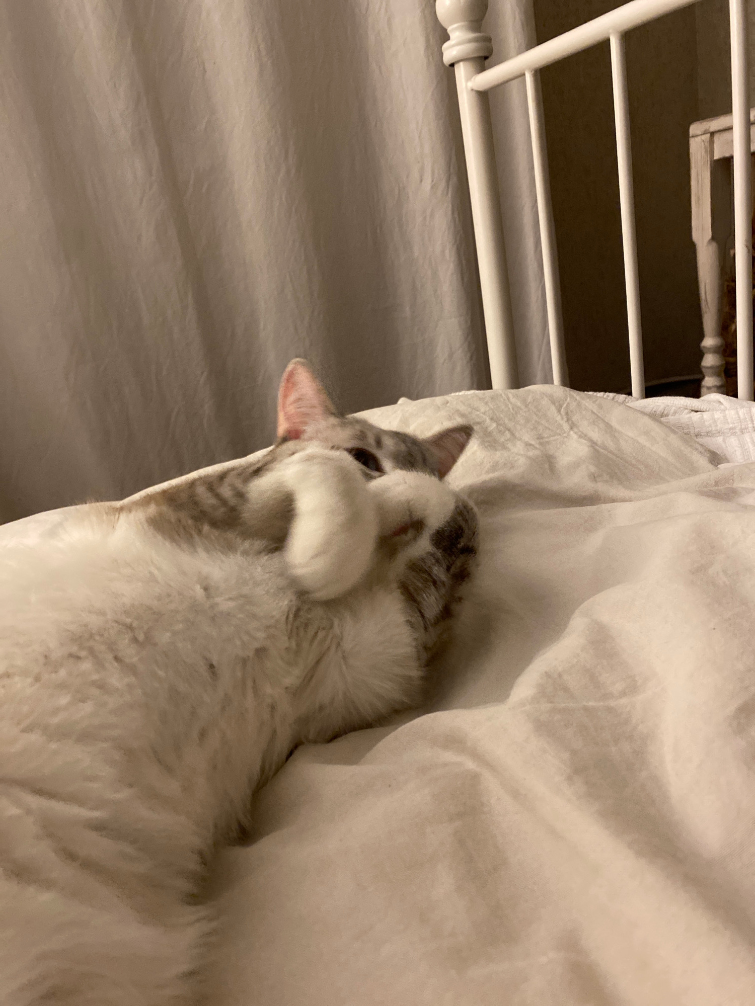 A cat rests on a bed. The bed has a white metal frame and a white sheet. The cat is primarily white with some gray patches. It has its paw raised to its face. The location is inside a residence, not i…read more