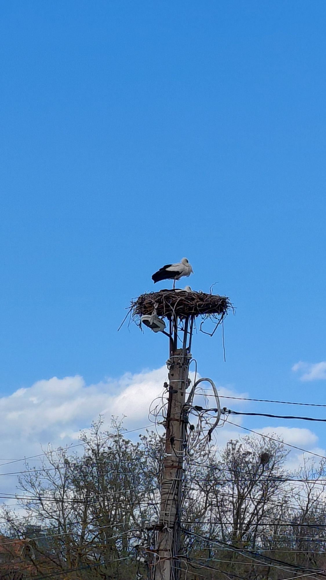 The image shows a stork nest on top of a utility pole against a bright blue sky with scattered white clouds. Two storks are visible: one standing on the edge of the nest with its head turned, and anot…read more