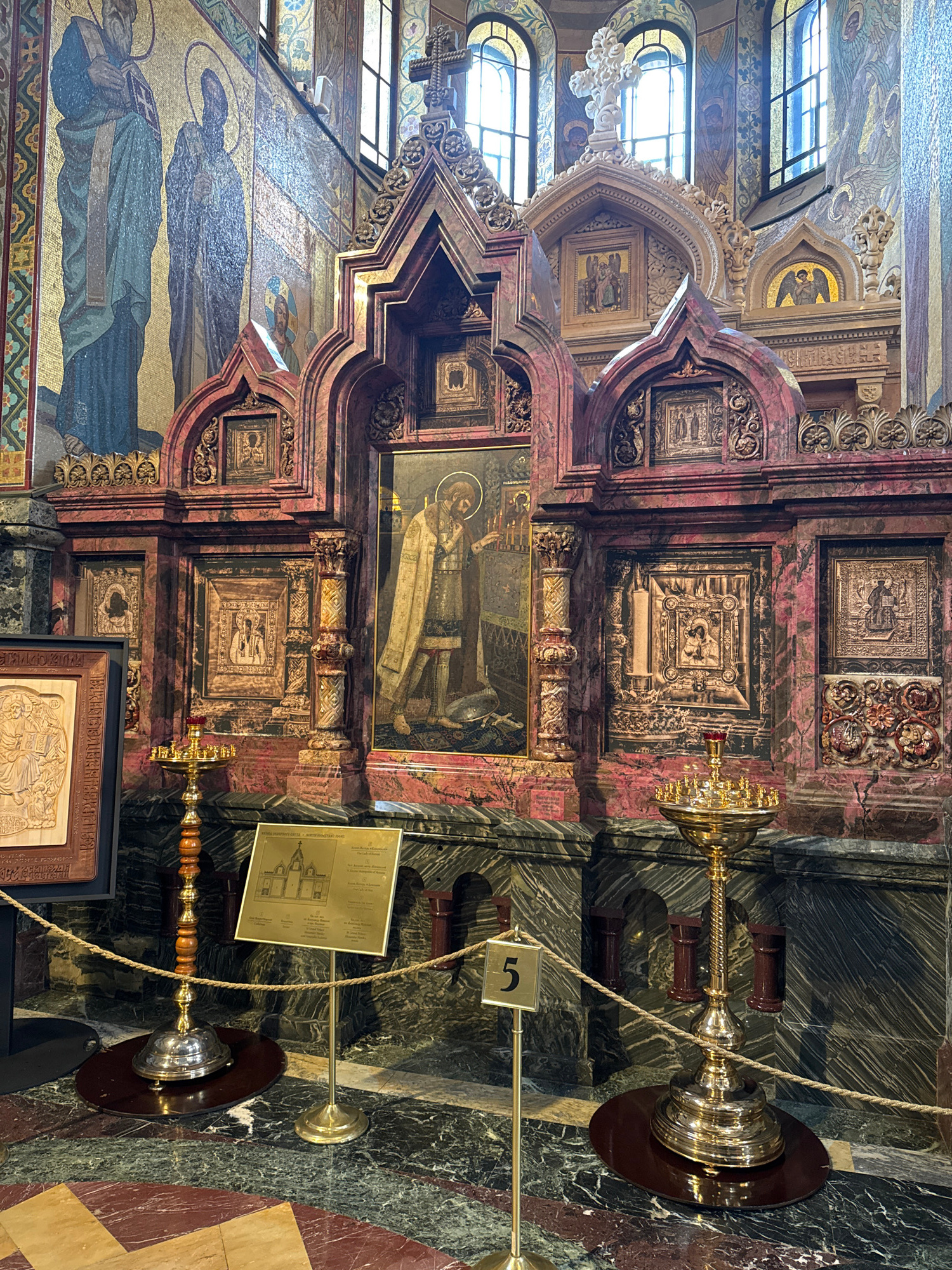 The image captures an interior shot of the Church of the Savior on Spilled Blood, located in Saint Petersburg, Russia. The viewpoint is focused on a section of an ornate, mosaic-filled wall featuring…read more