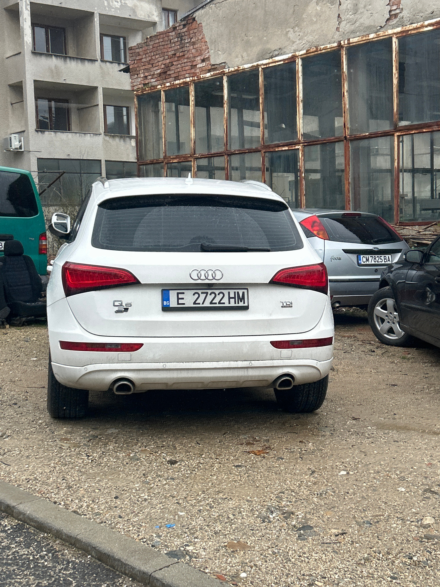 The image shows a white Audi Q5 parked on a street in Zlatograd, Bulgaria. The license plate reads "E 2722 HM". A silver Ford Focus with license plate "CM 7825 BA" is parked nearby. The environment in…read more