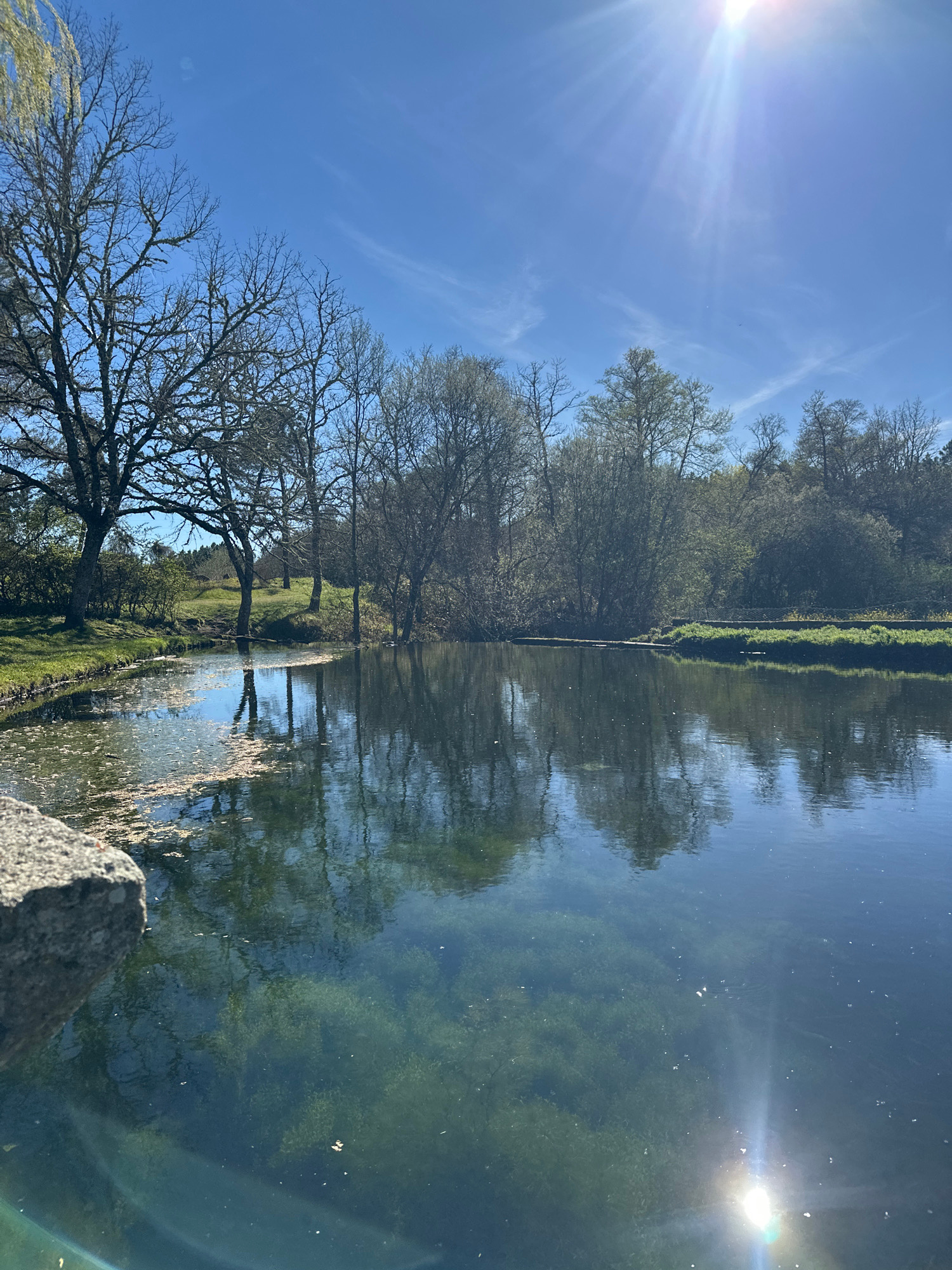 This image depicts a natural outdoor scene in Vila Real, Portugal, under bright, sunny conditions. A clear blue sky occupies the upper portion, featuring a prominent sun in the upper right, casting vi…read more