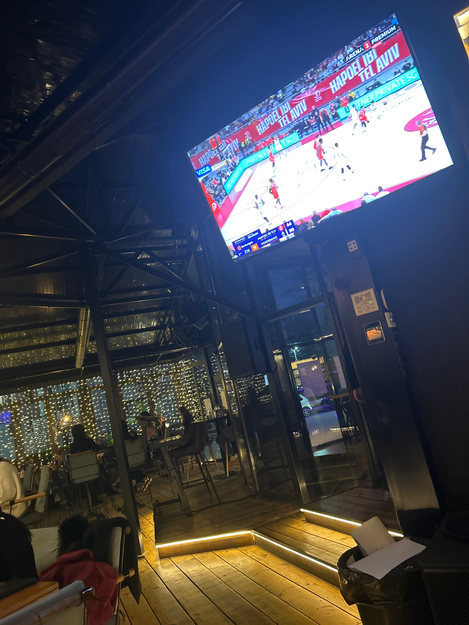 A low-angle indoor shot depicts a television screen displaying a basketball game with text in Hebrew, including "HAPOEL TEL AVIV," "ARENA 2 PREMIUM," and "VISA." The screen also shows score informatio…read more