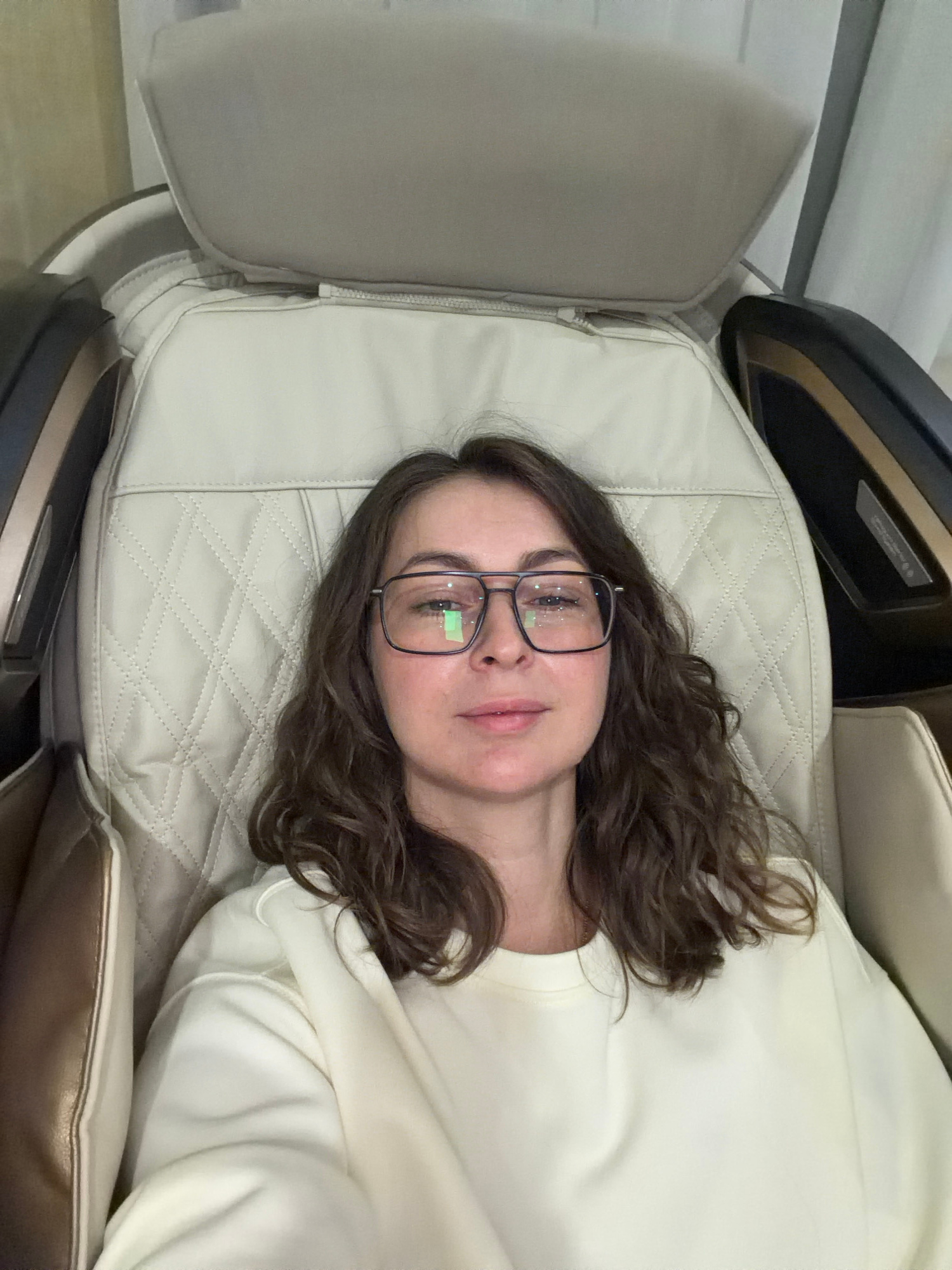 A medium shot shows a woman with brown, shoulder-length curly hair and glasses lying on a light beige leather recliner. She wears a light cream-colored sweater. The recliner has quilted detailing. The…read more