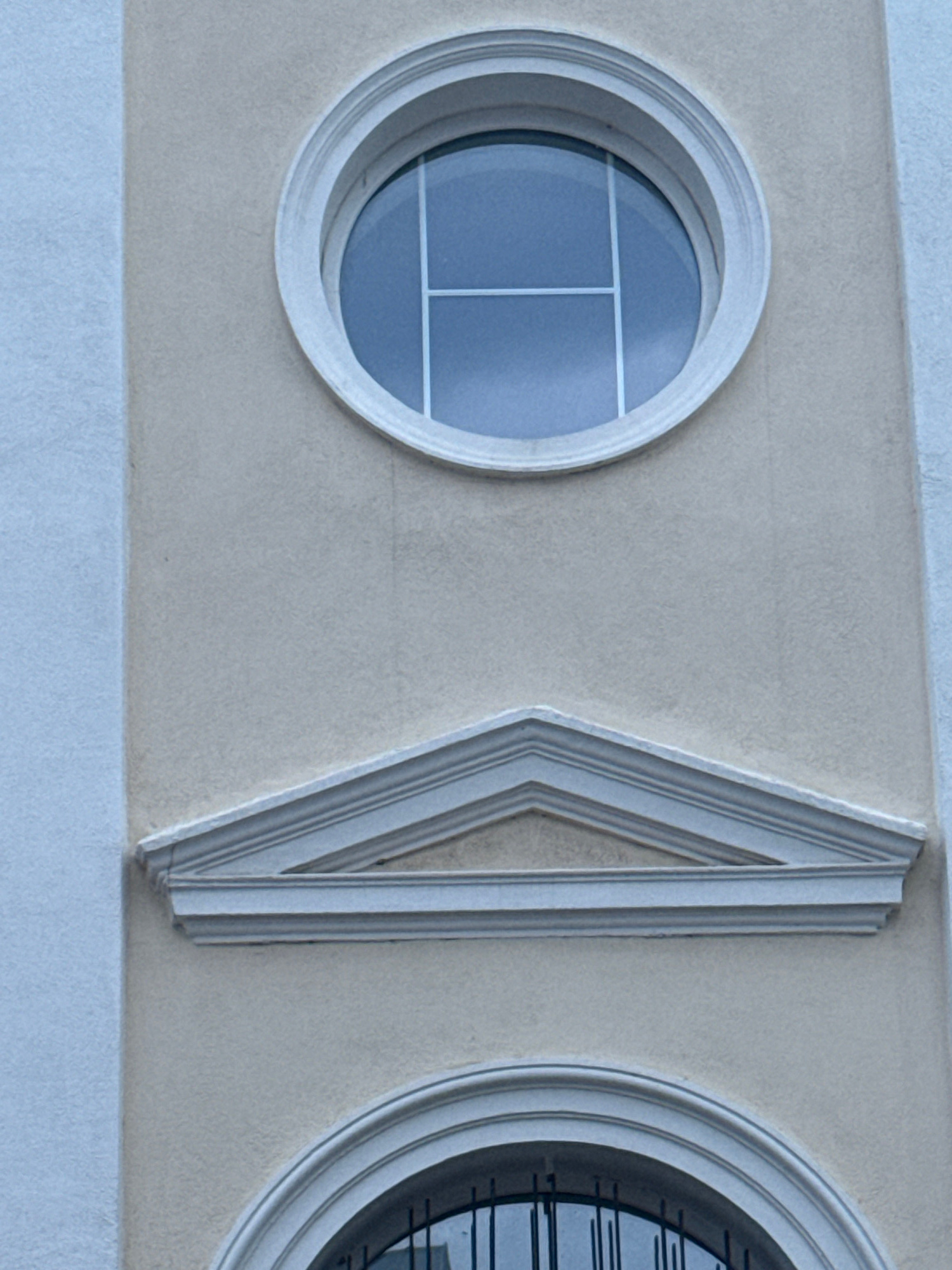 The image presents a close-up architectural detail of a building facade in Yambol, Bulgaria, featuring two circular windows flanking a vertical, diamond-shaped architectural molding. The facade is pai…read more