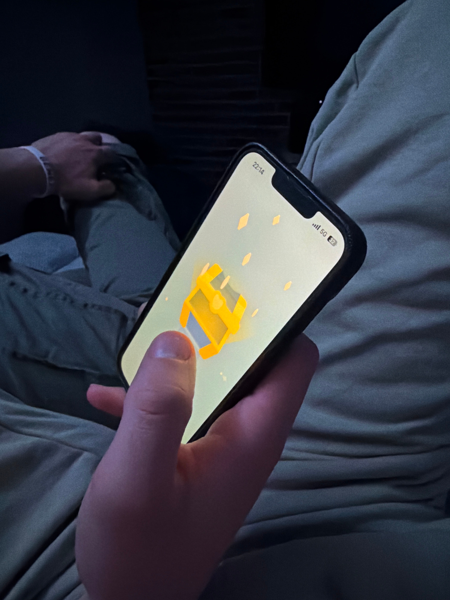 A person is holding a smartphone with a game displayed on the screen. The game appears to involve collecting yellow gems and a yellow chest. The person's finger is on the screen, presumably interactin…read more