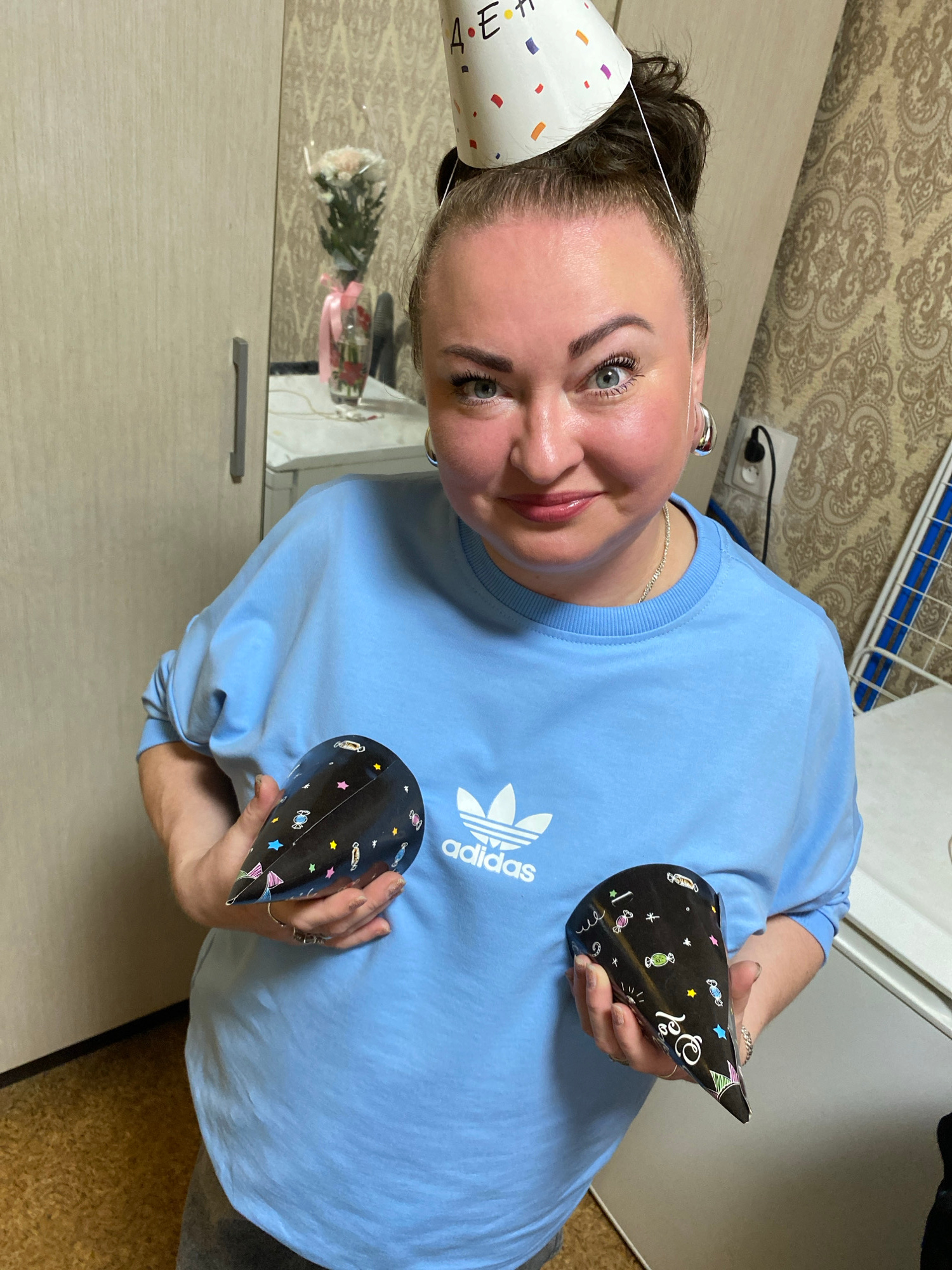 The image shows a woman in Chaikovsky, Russia wearing a light blue Adidas T-shirt and a birthday hat. She is holding two black party hats with colorful decorations. The background includes a patterned…read more
