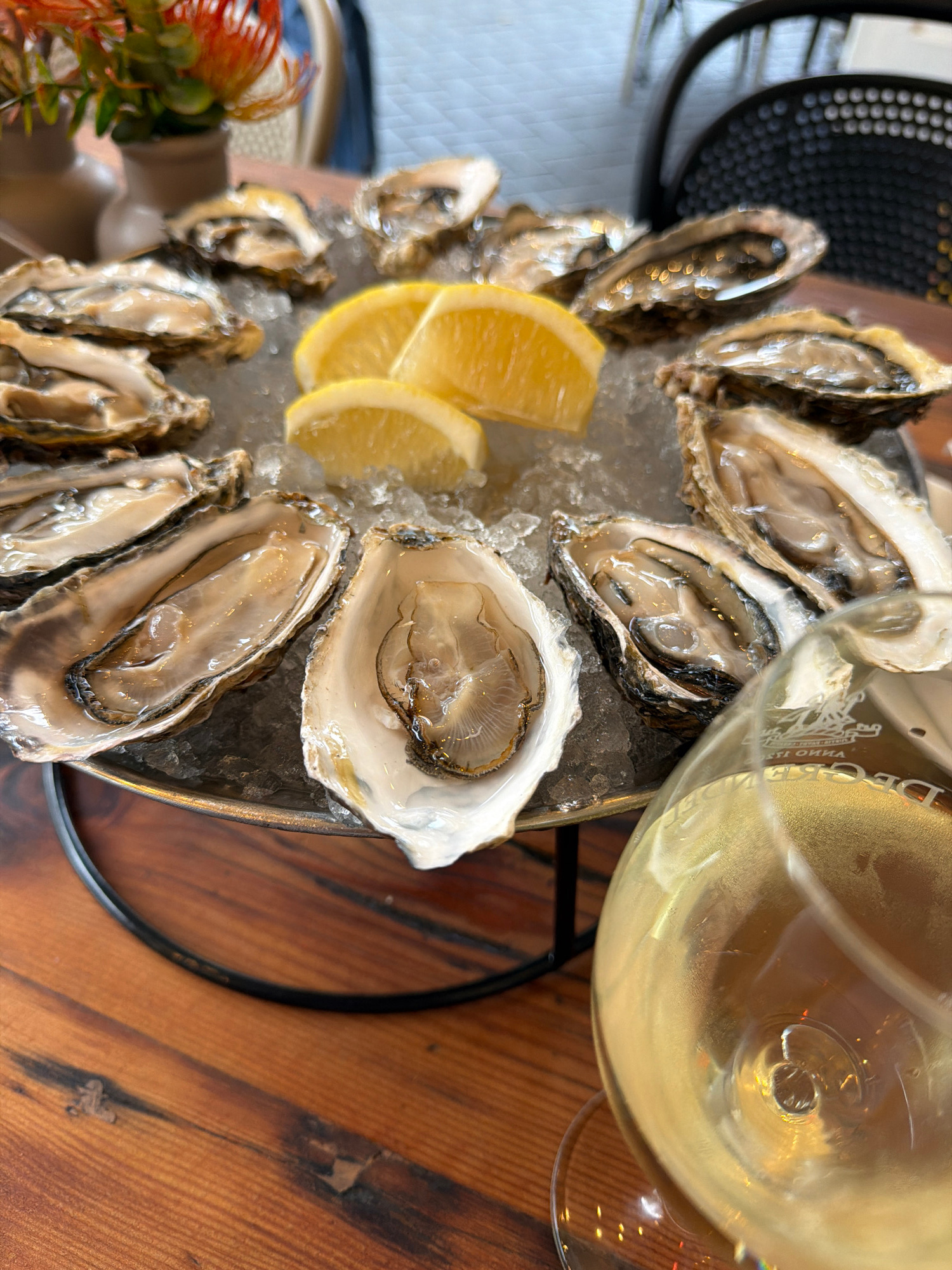 This close-up, high-angle shot captures a platter of fresh oysters arranged on a bed of crushed ice, accompanied by bright yellow lemon wedges. Approximately a dozen shucked oysters, glistening with m…read more