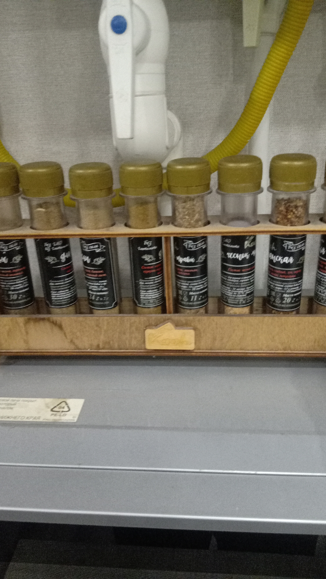 A close-up shot depicts a spice rack filled with various spice containers. The rack is made of light-colored wood and holds approximately seven or eight cylindrical spice jars with gold-colored lids.…read more