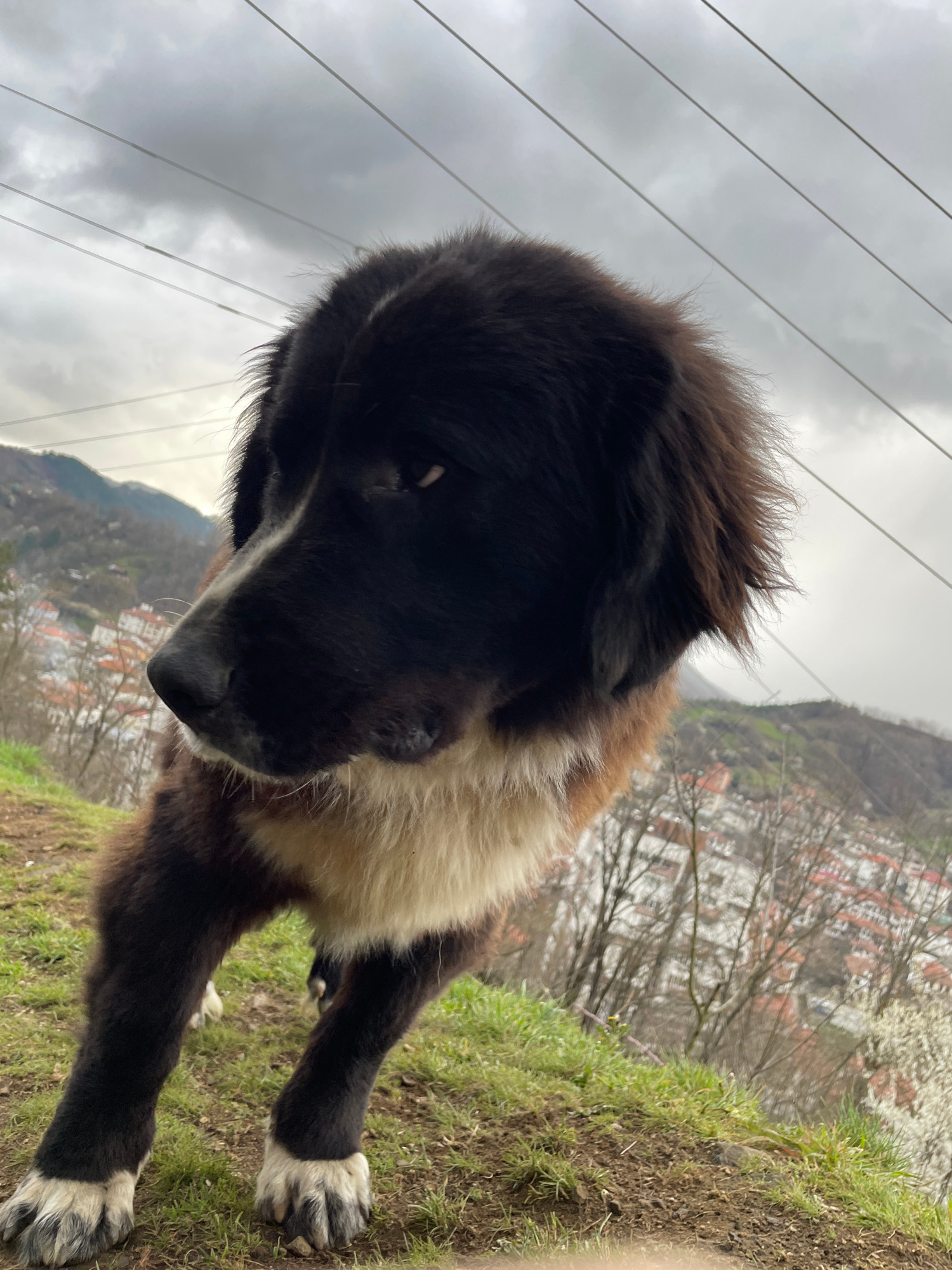 A medium-length haired dog, predominantly black with white markings on its chest and paws, stands on a grassy verge. The dog's head is angled downward, with a focused expression. The background featur…read more
