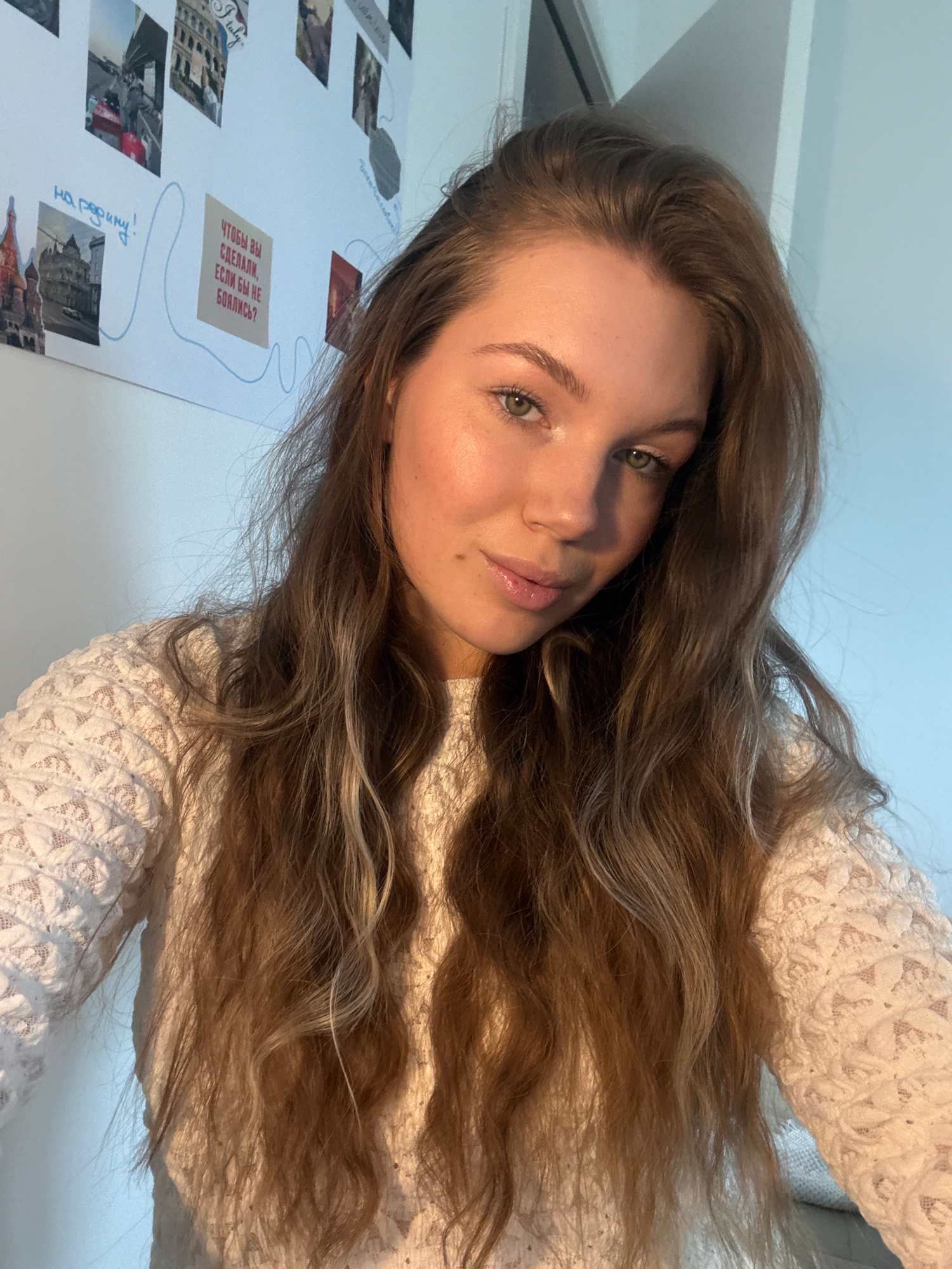 A young woman with long, wavy brown hair is posing for a selfie. She is wearing a white lace top. In the background, a white wall is visible with a collage of photos and text in Russian. The location…read more