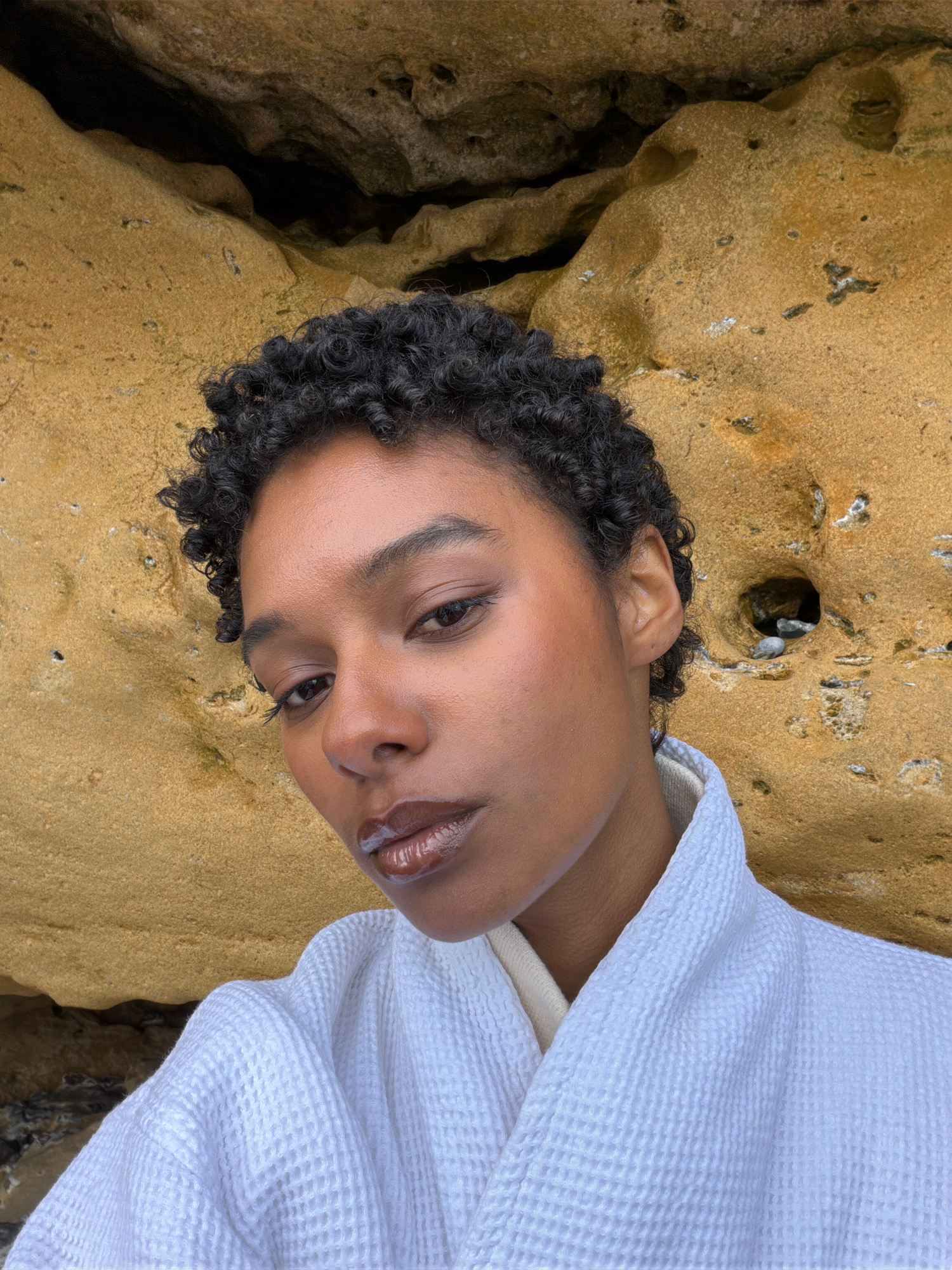 A woman is lying on a rocky beach. She has curly dark hair, tan skin, and wears a white bathrobe. The rocks are yellow-brown, and there is a small hole in one of them. The location is possibly near th…read more