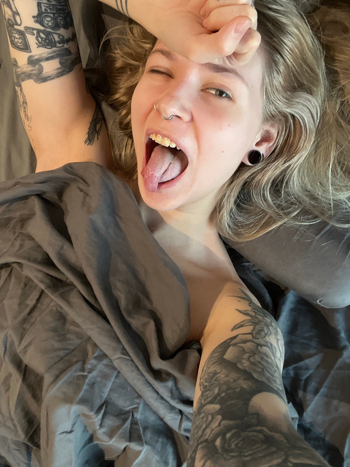 A young adult individual, identified as female, is depicted lying supine on dark grey bedding in an interior setting. The subject's head is towards the upper center of the frame, with light brown hair…read more