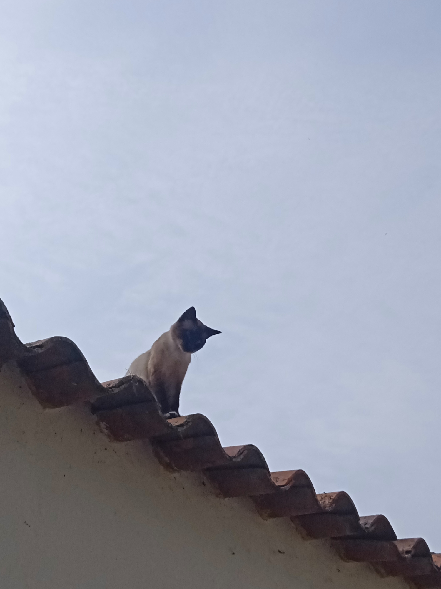 A Siamese cat perches on a curved terracotta roof in Montalbán, Venezuela. The sky is overcast and a small insect is visible in the sky near the center of the frame.